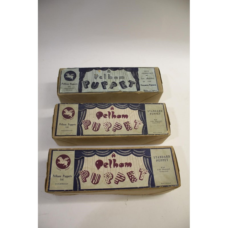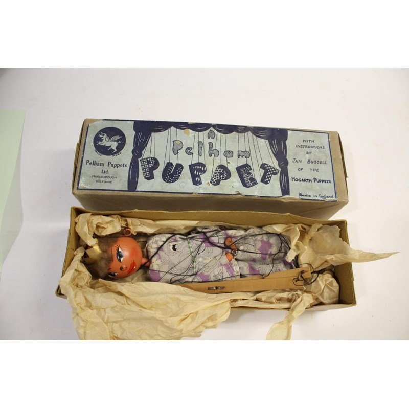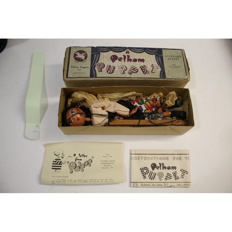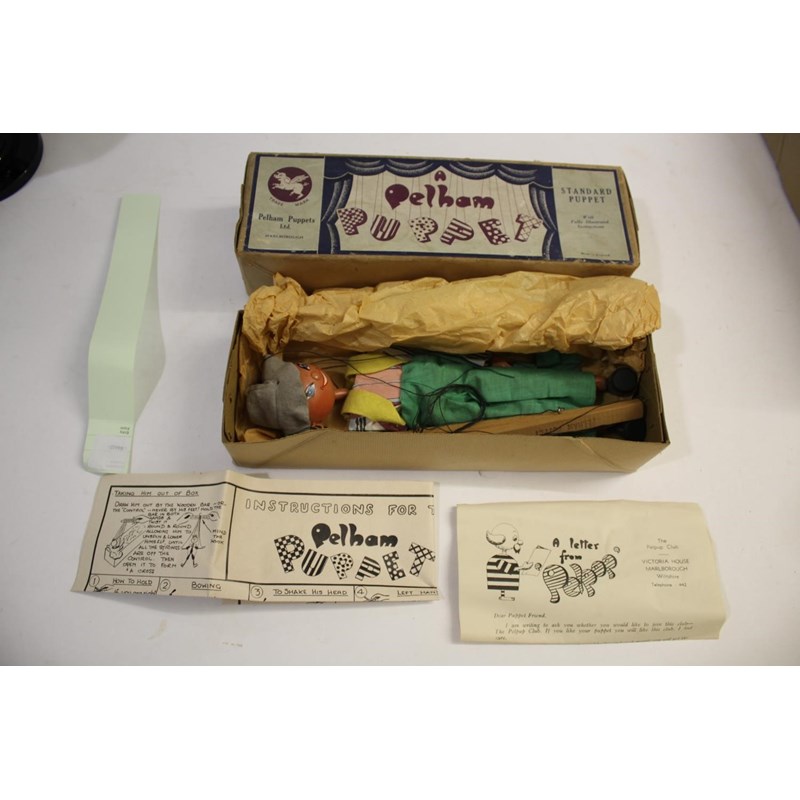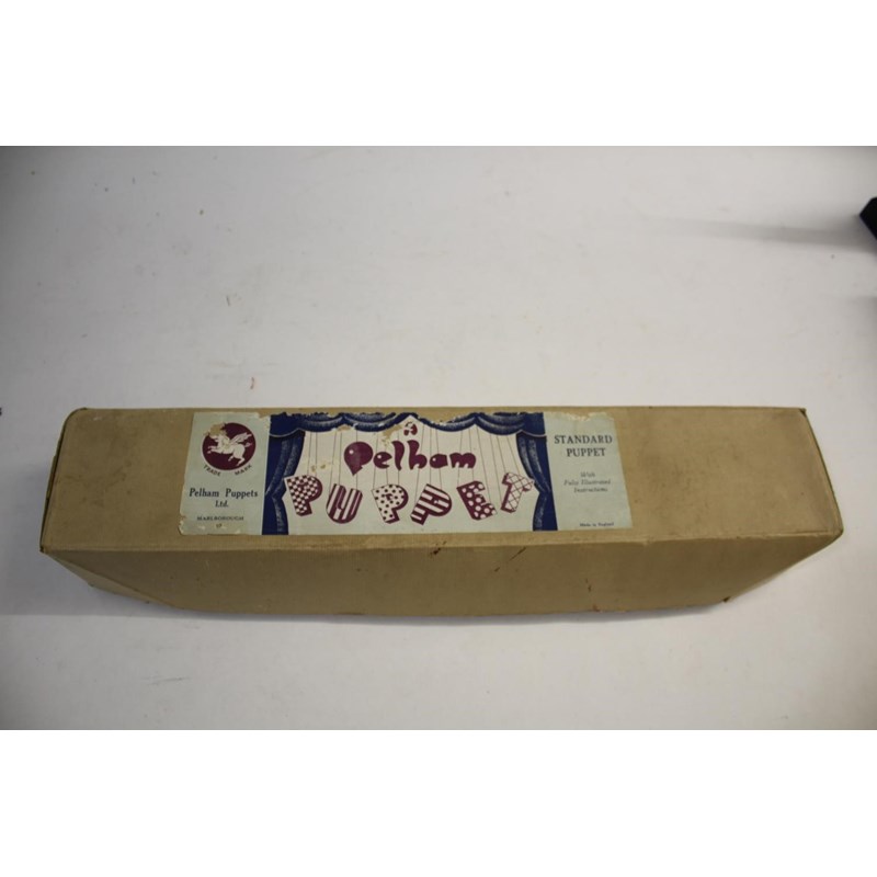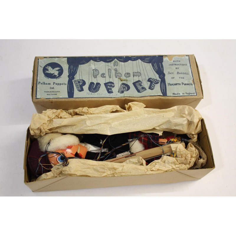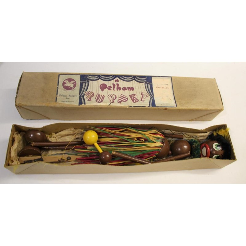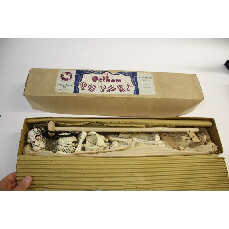 a large puppet in an early Pelham box, marked Lulubelle on the top of the box, also with a large boxed puppet Skeleton (in the correct box). Also with 3 other puppets in early boxes, not the correct boxes for the puppets, and a boxed Macboozle. (6)