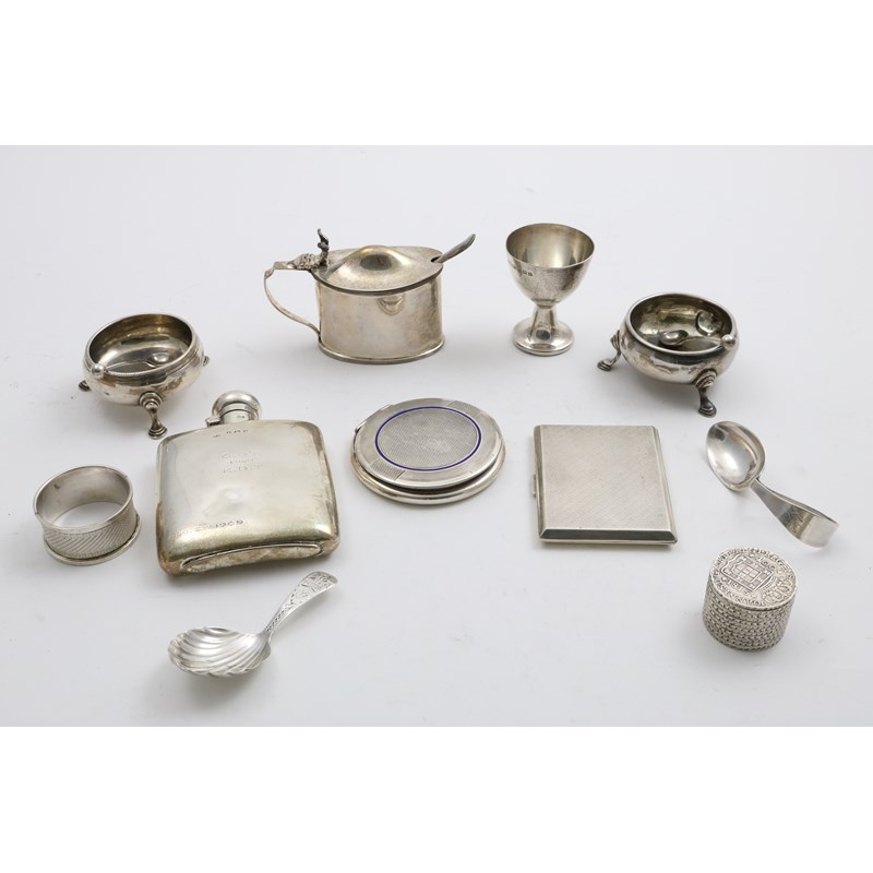 to include: a bright-cut caddy spoon, initialled, 3 condiments and 3 spoons, a engine-turned cigarette case, a compact, a child's spoon, inscribed, a egg cup, initialled, a spirit flask, inscribed, a napkin ring, initialled and a continental box resembling a stack of coins; the flask 4.1" (11cm) high; 20.3 oz (14)
