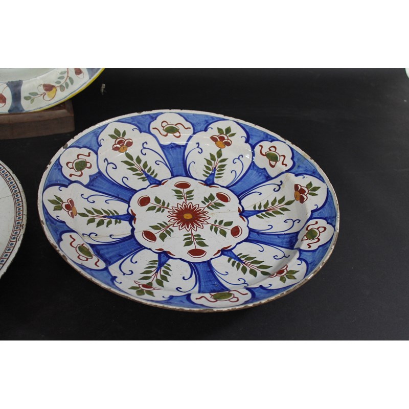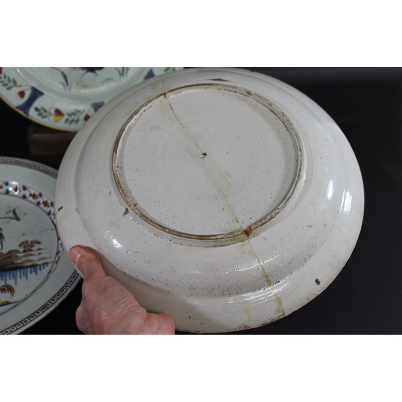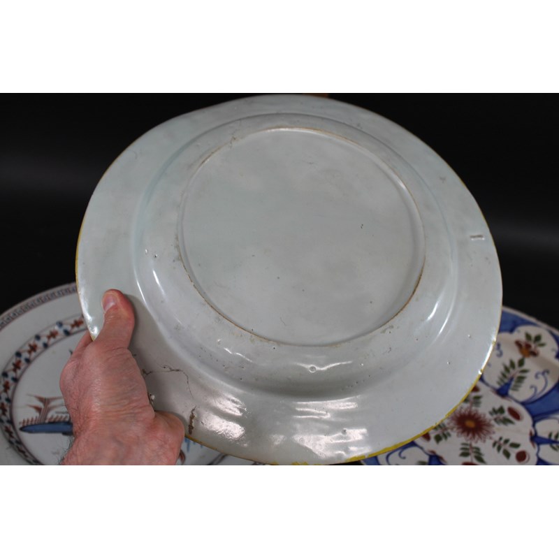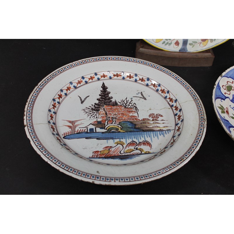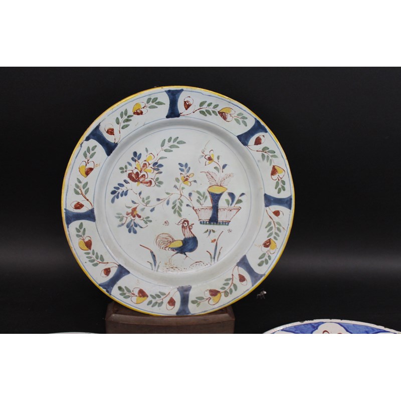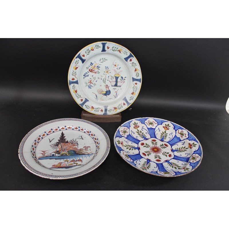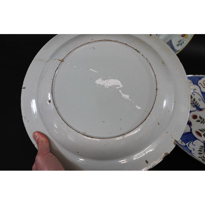 an 18thc delft charger possibly Vauxhall, painted in polychrome colours with a cockerel and sprays of flowers and a floral border, cracked, 34cms diameter. Also with a delft charger painted with a house within a landscape scene (cracked, 34cms diameter), and a delft charger brightly painted with a floral design (cracked, 34cms diameter). (3)