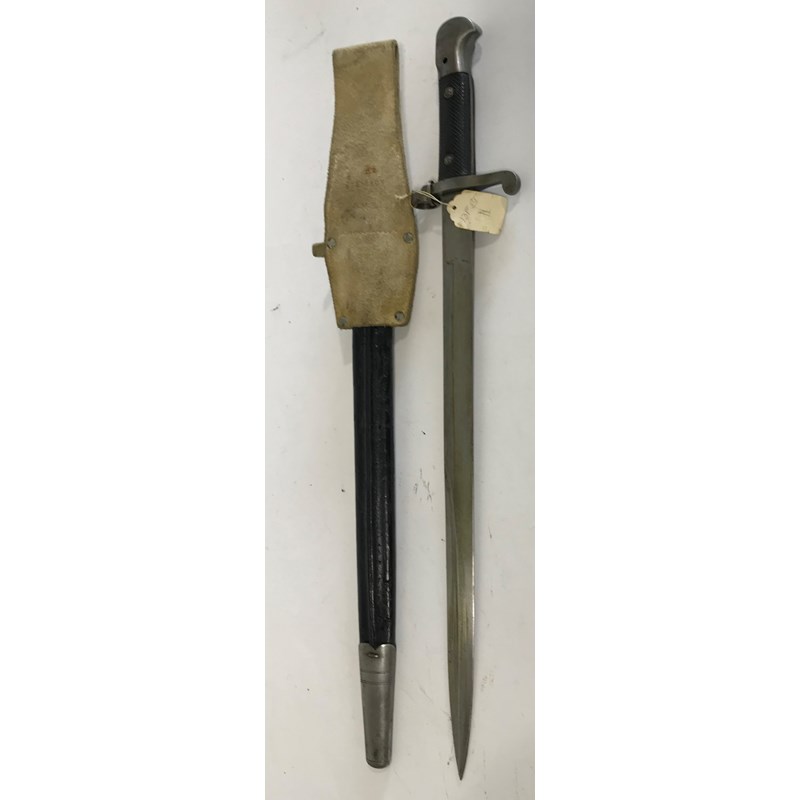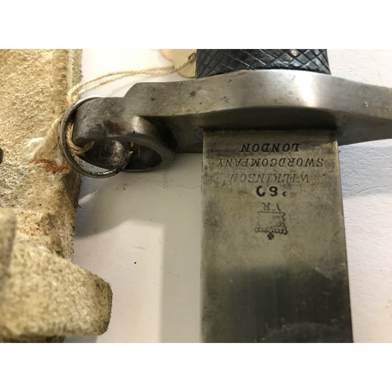 A Victorian bayonet with a 46cm blade with various marks including War Department Arrow, VR and 'Wilkinson Sword Company'. In a leather and steel scabbard, 61.5cm overall, in a buff frog.