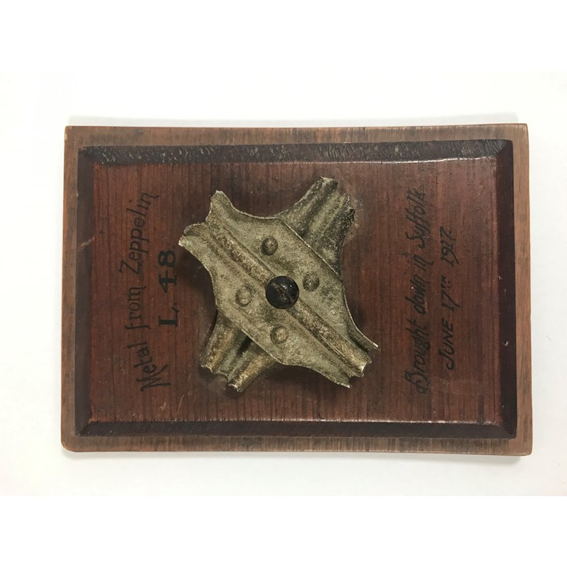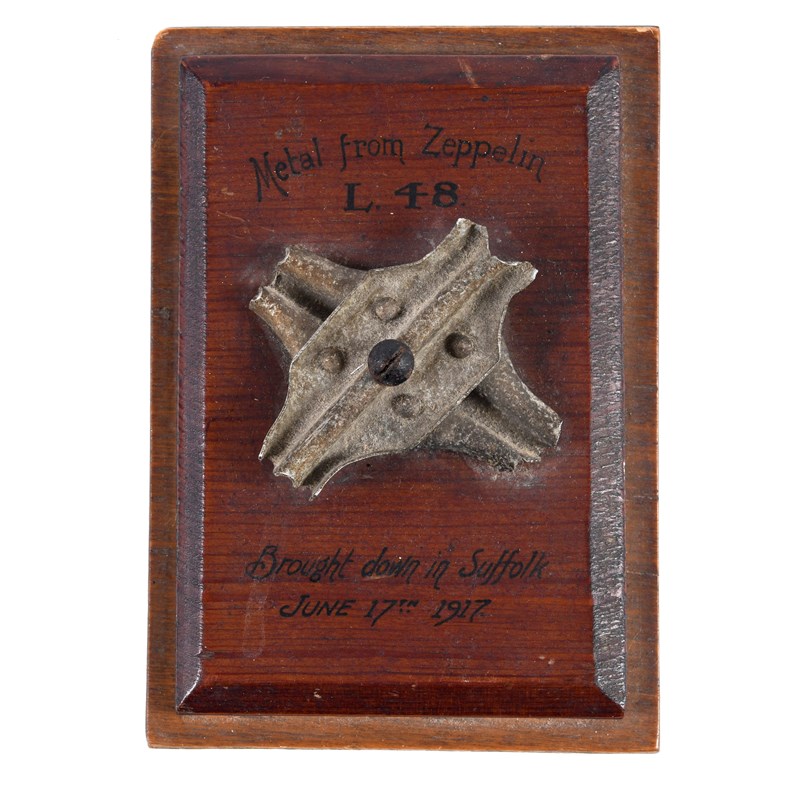 ZEPPELIN L.48 A small mounted cross section on a display board inscribed 'Metal from Zepplin L. 48 Brought down in Suffolk June 17th 1917'. 13 x 9cm. Zepplin L.48 was part of a bombing raid on London, with a crew of 19 she was brought down by aircraft from Orfordness crashing in a field at Theberton in Suffolk, three of the crew members survived the crash apparently making them the only people ever to survive from a burning airship in England. The crash site featured in a BBC Time Team programme from 2006 and the raid and crash are recorded in the book Zeppelin over Suffolk by Mark Mower, 2008.