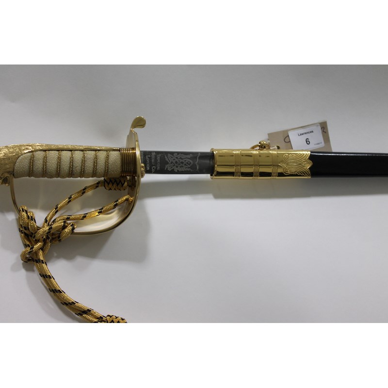 A QE11 period Naval Officers Sword complete with scabbard/swordknot and carrycase. In exceptional condition with Imperial Sword Co London, on the crisp blade. Engraved with Britannia Naval College 1905-2005, amid foilage and other ropework designs.