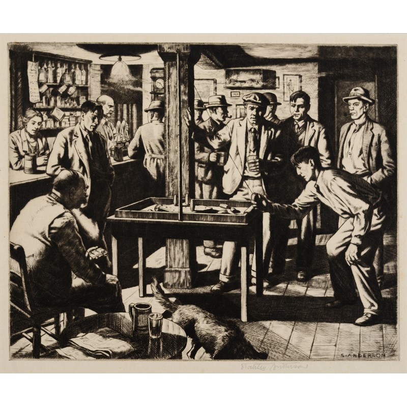 ‡STANLEY ANDERSON, CBE, RA (1884-1966) BEER AND SKITTLES Etching with drypoint, 1933, signed and inscribed Edition 32 in pencil, unframed 18 x 22cm.; with Anderson's Bookplate for Margaret Grindley Ferris, engraving, 1941, signed and inscribed one of 18 signed prints, 10.5 x 7.5cm. (2) * The principal item shows the Golden Heart pub, Painswick, Glos. In 1941, Miss Ferris was a medical student living in Johannesburg. She later specialised in psychiatry. The choice of a cluttered bookshop has been seen as a respectful nod to history coupled with a pioneering spirit.
