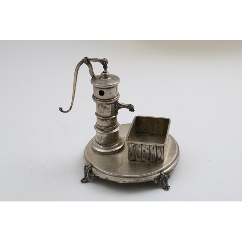 in the form of a water pump and trough on a circular base, a long looping handle (for snipping cigars), the trough for vestas with a textured outer finish (for striking), resting on four feet, maker's mark "K&S" (incuse),(date letter unclear), Hamburg 1860-80; 6.25" (16 cms) high