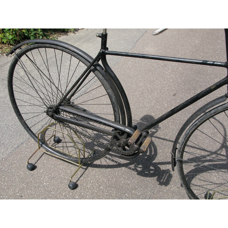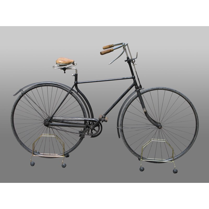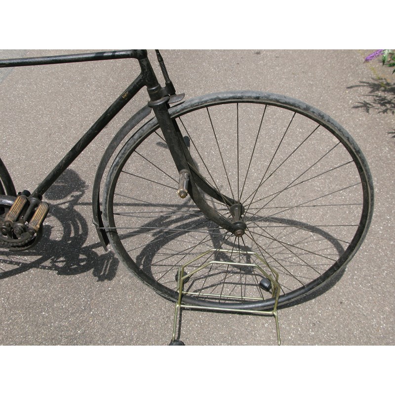 A sound and highly useable machine with a 21-inch frame. Carefully restored to a good standard, the features include crescent-shaped 24-inch handlebars with turned wooden grips and correctly finished in straw-coloured nickel-plating, original 6-inch chain set with dual-link inch-pitch driving chain, chain-guard, 7-inch cranks retaining their original block rubber pedals, front plunger brake, mudguards, mounting step, nickel-plated saddle support and duple pad leather saddle,30-inch wheels with 1-inch crescent rims and tyring. A sound, useable bicycle. (1)