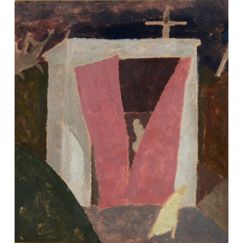 * Executed in 1920-1921 (a later pencil inscription on the backboard states `Dated by Gilbert Spencer at gallery opening, Cookham`), the subject relates to the passage in St. Mark's gospel, Chapter 15, vs.37-38: "And Jesus cried with a loud voice and gave up the ghost. And the veil of the temple was rent in twain from top to bottom." This is apparently a study for a large Crucifixion picture which Spencer never brought to fruition, although a further study for the subject from 1921 is in Aberdeen Art Gallery