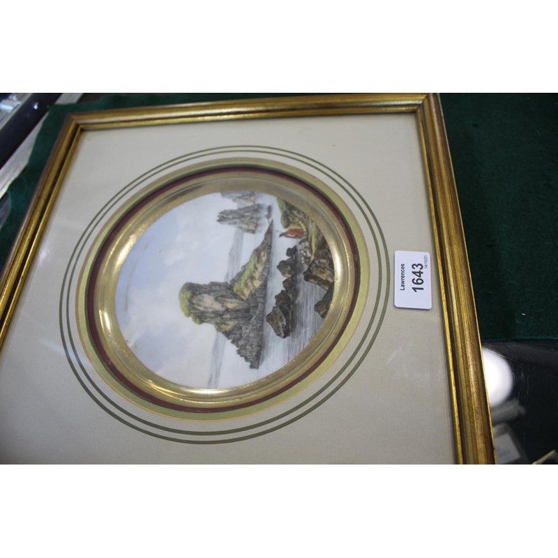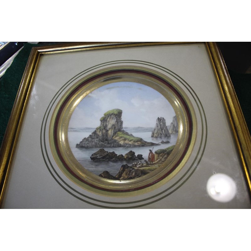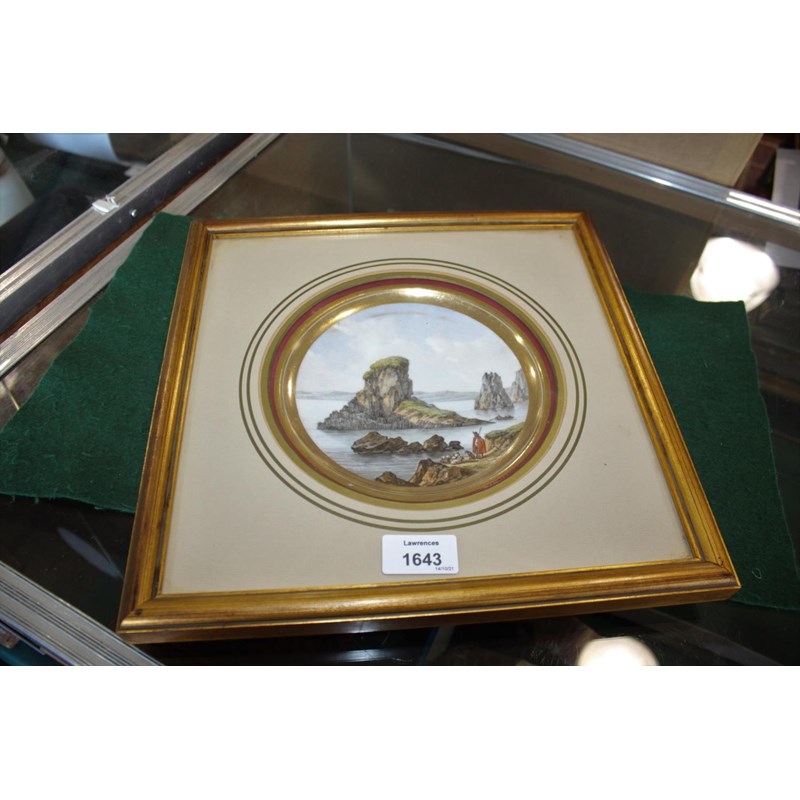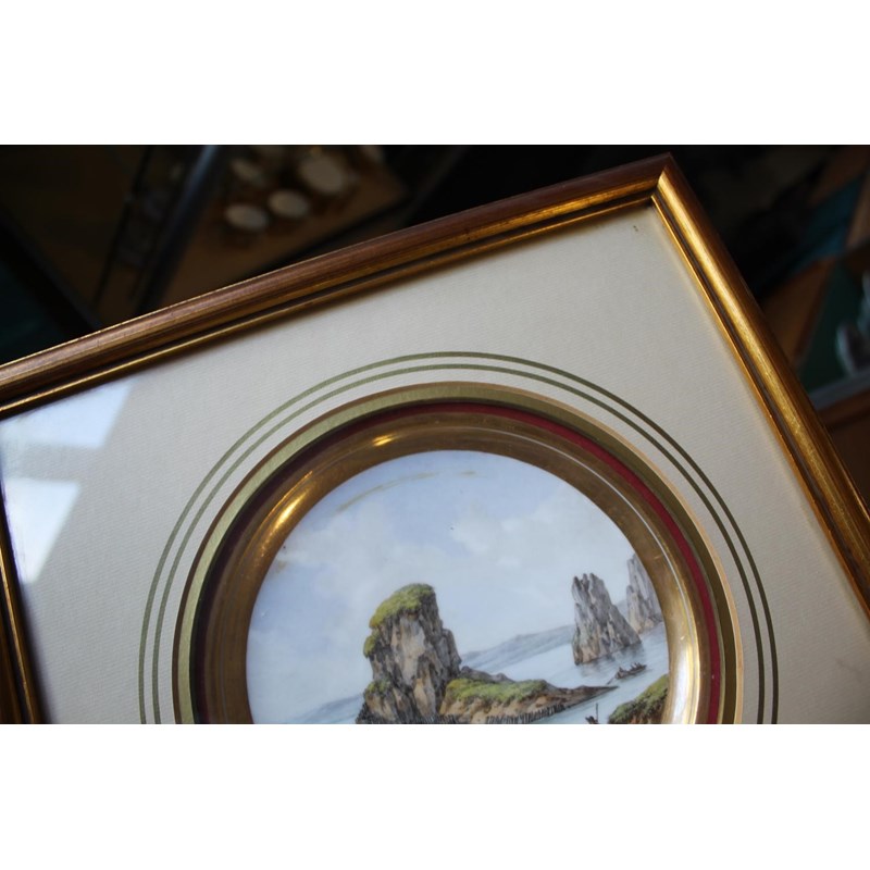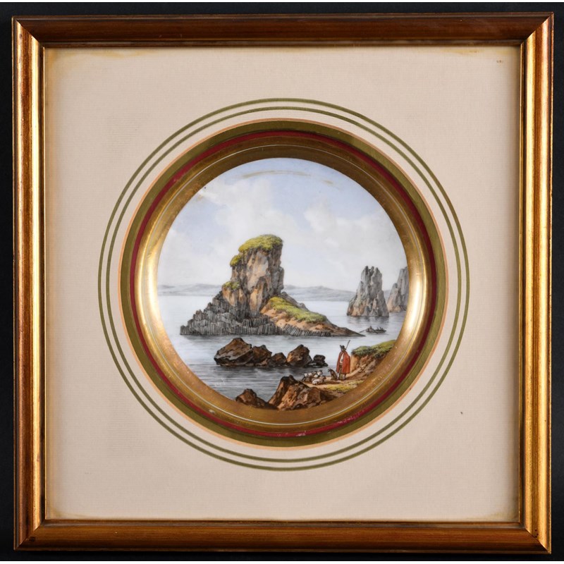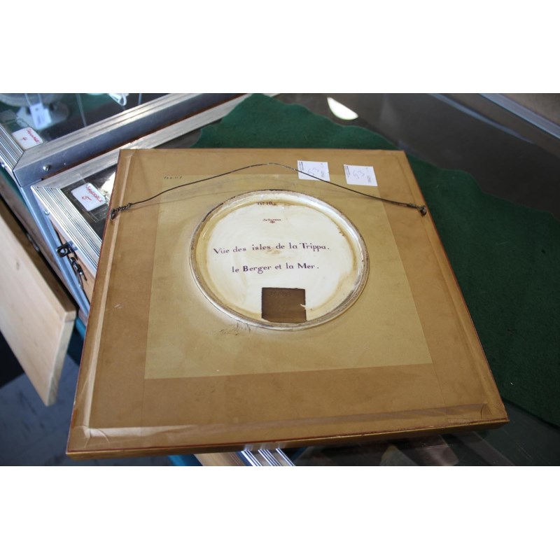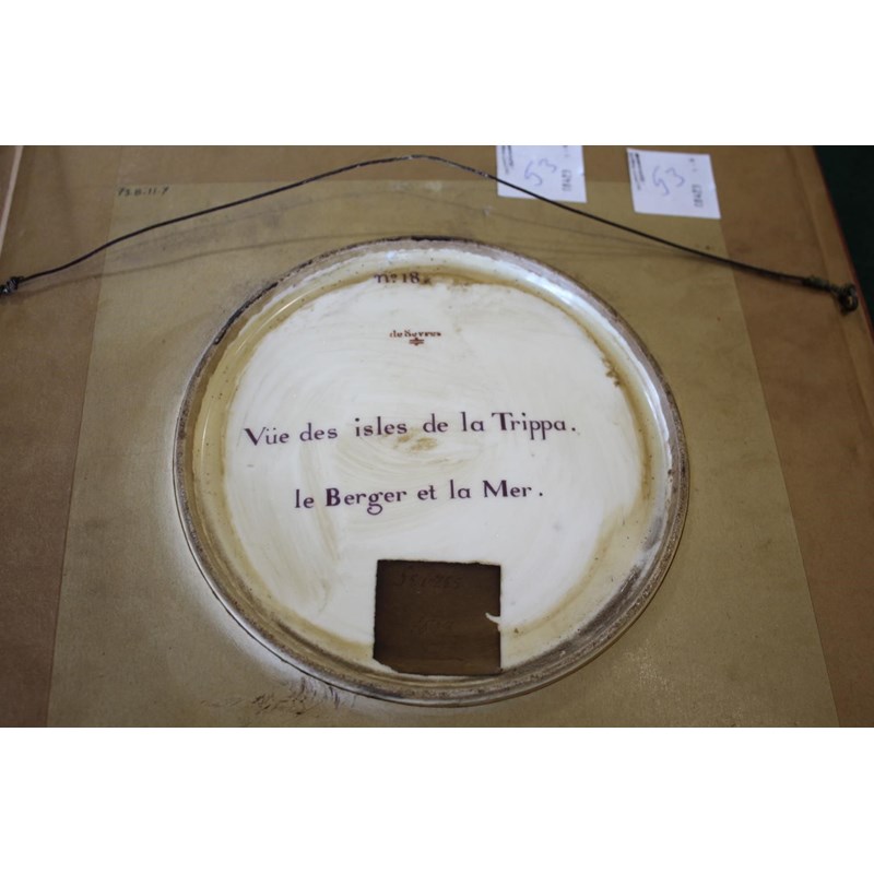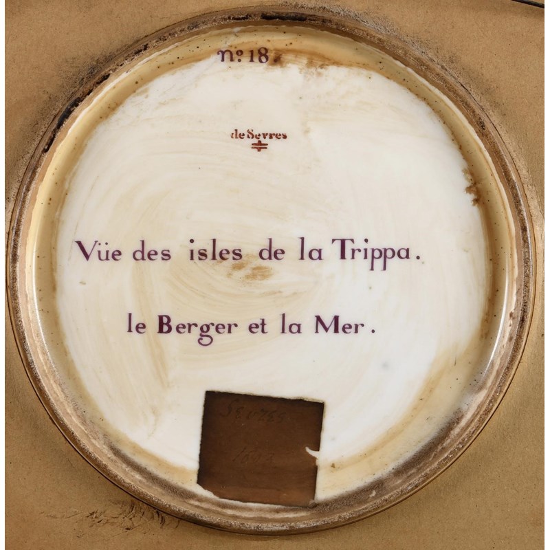 FRAMED SEVRES TOPOGRAPHICAL PLATE a circular porcelain plaque painted with a shepherd and sheep on a cliff top, overlooking a rocky coastal scene. Marked to the back, de Sevres (in red), No 18, Vue des isles de la Trippa, le Berger et la Mer. Mounted in a modern frame. Frame 30.5cms square *This plate appears to have been made in the style of the famous Fond Pourpre Fable plates 'Service de L'Archicancelier', a service made in early 19thc. A plate with the same title was sold in a group lot at Christies in 2010, lot 650, Auction 2350.