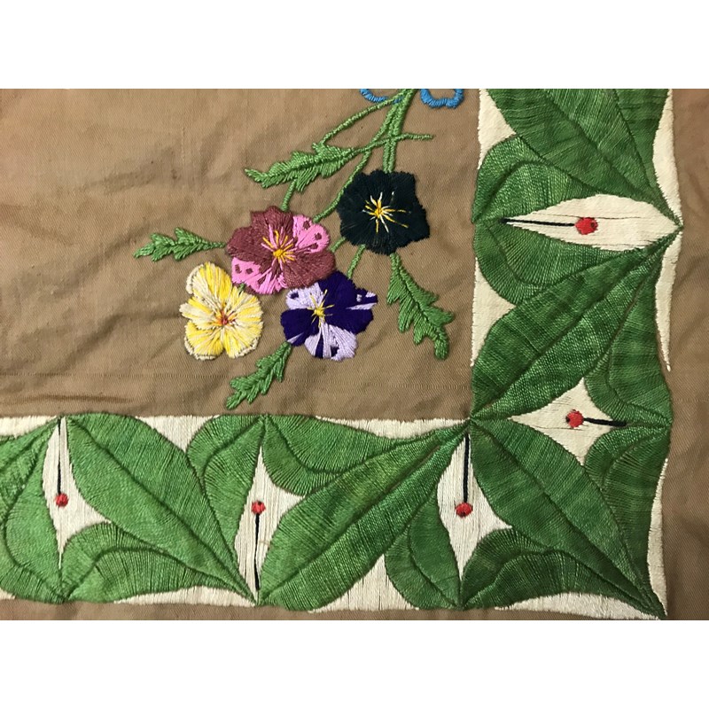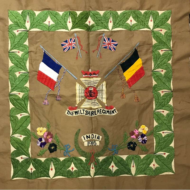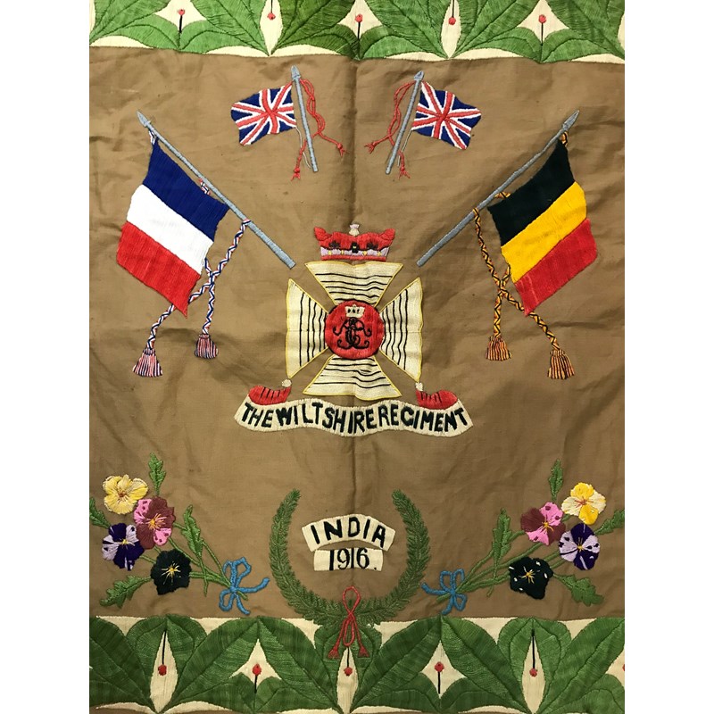 The panel with a central Wiltshire Regiment crest beneath flags of France, Belgium and Great Britain above 'India 1916' within a wreath flanked by ribbon-tied flowers, all within a foliate border. With an attached note 'Worked by William Frederick Street of Hants in Afghanistan during the First World War when he was sent as a motor bike dispatch rider in the North West Frontier, having many hours to fill whilst waiting for dispatches to be taken to different forts etc. he started needleworking'. 29 inches square. With an album of photographs including images of members of the Wiltshire regiment amongst which a soldier with motorcycle, a pocket compass, military issue, 1915 and two shooting medals, one named to W.F.Street.