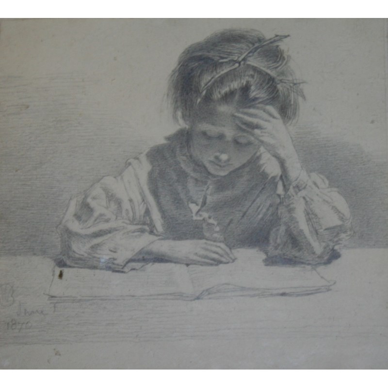 to comprise two frames containing a total of 17 sketches in ink, pencil and watercolour (charming studies of children - see illus , landscapes, figure groups and a still life), some initialled and dated 1845-1872; another ink sketch of a Manchester (?) street scene, 1862; an album of photographs of his work with a `memoir` biography by Thomas Letherbrow; a copy of `Warwick Brookes' Pencil-pictures of Child Life`, also by Letherbrow, 1889; 6 watercolours by his son, Warwick T. Brookes, c.1917; and 5 boxes of photographic glass negatives of Brookes Senr's work (a lot)