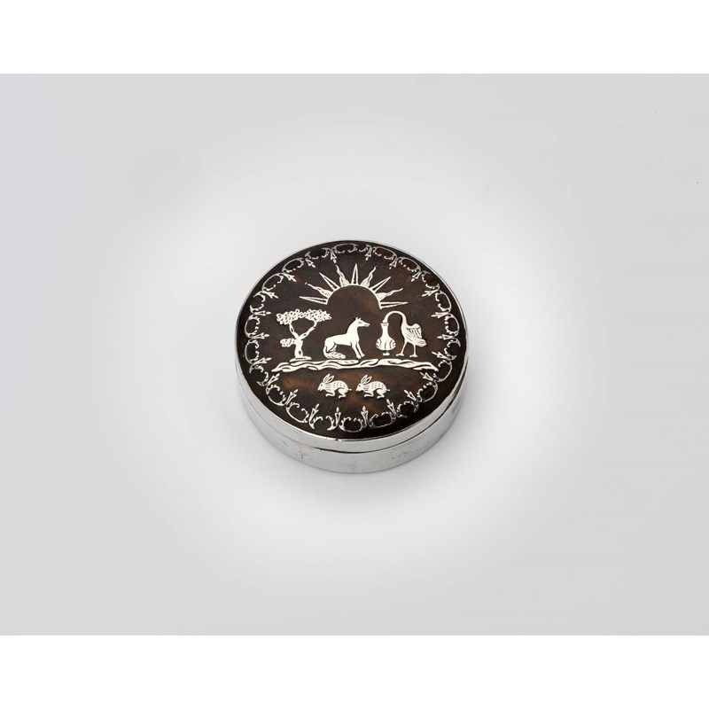 circular with a pull-off cover, inlaid with pique-work animals (probably from Aesops Fables), a sun & a tree within a regular border, unmarked, c.1760; 2.2" (5.5 cms) diameter