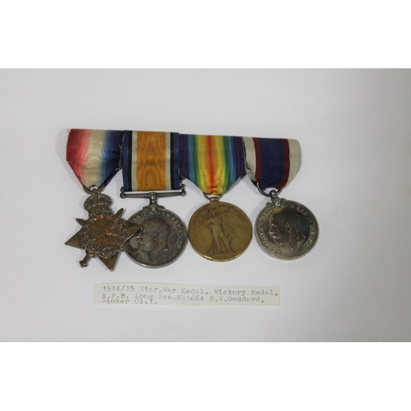 A Royal Navy Trio comprising 14-15 Star, British War and Victory medals and a George V. Royal Fleet Reserve Long service and good conduct medal named to K21664, Bertie V. Goddard, Stoker 1st Class. R.N. Serving aboard H.M.S. Vivid. the last to (DEV.B.13399) B.V.Goddard Sto 1. R.F.R. H.M.S. Vivid was the former H.M.S. Cuckoo, an Ant class iron screw gunboat, probably based in Plymouth. Mounted as worn.