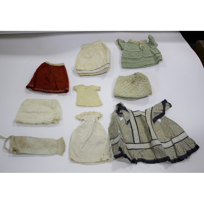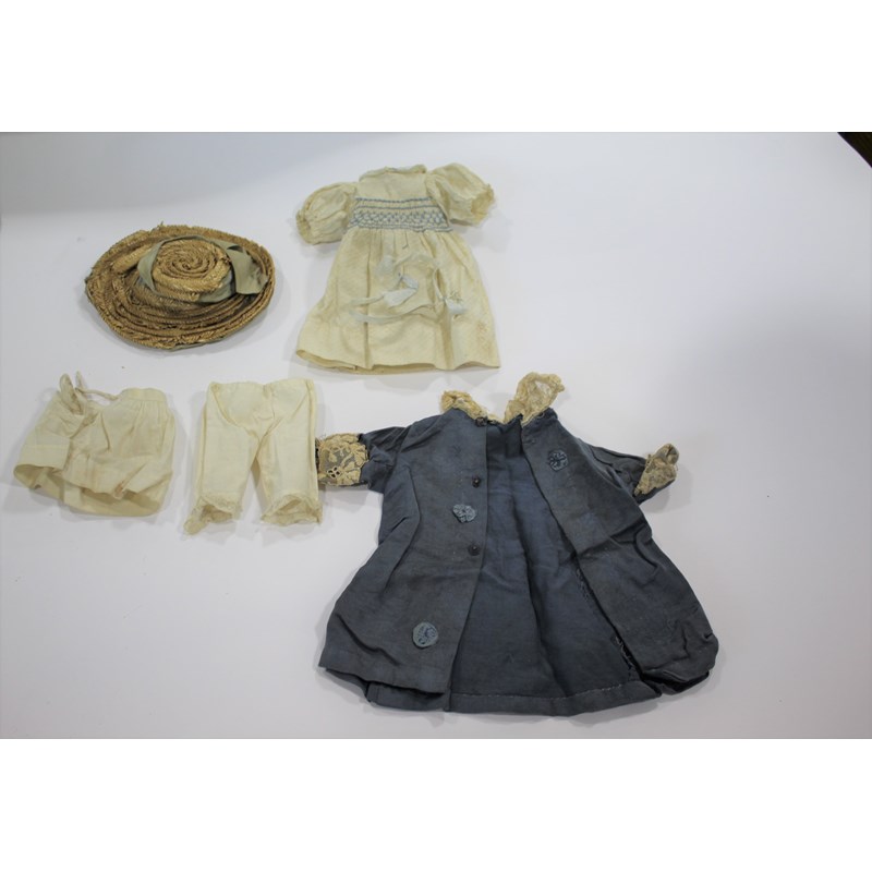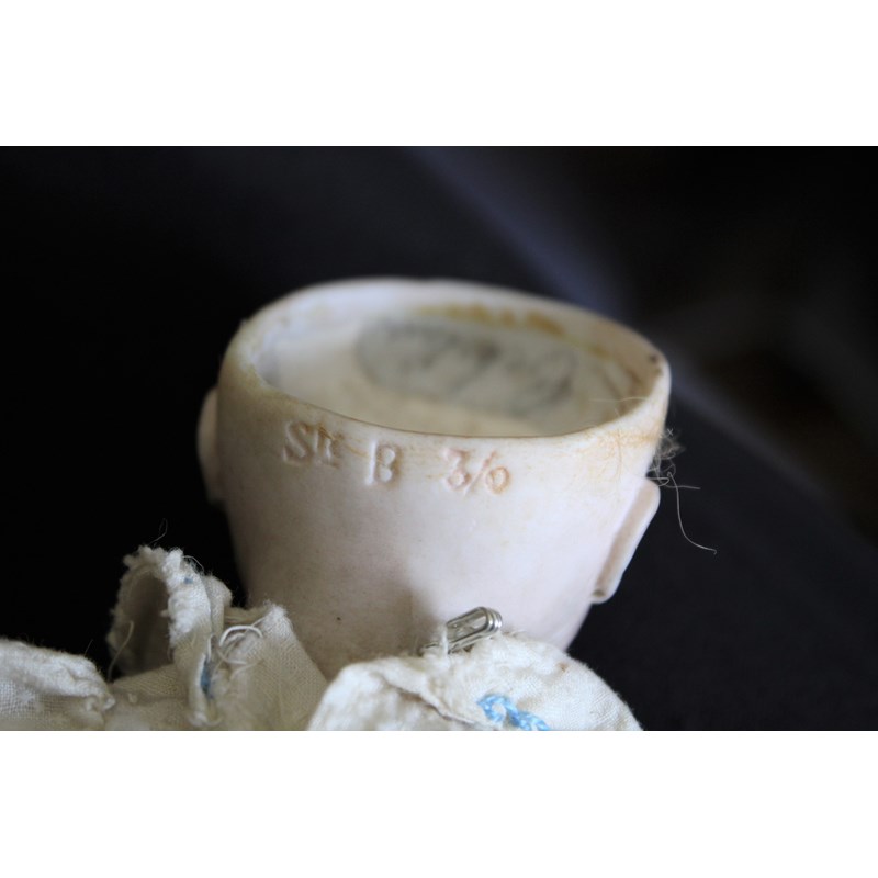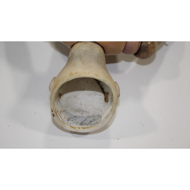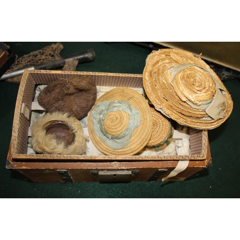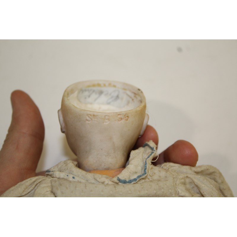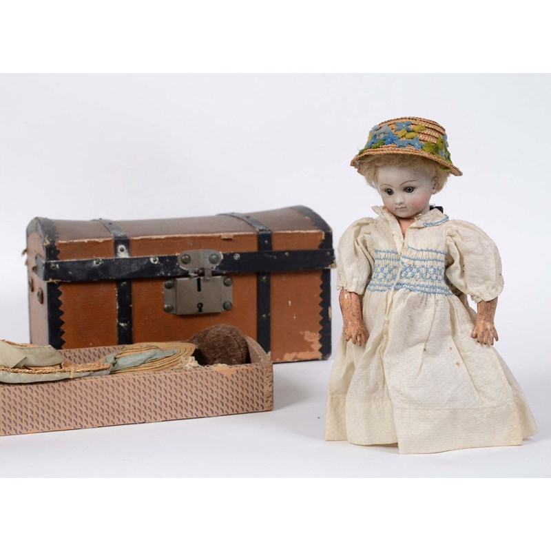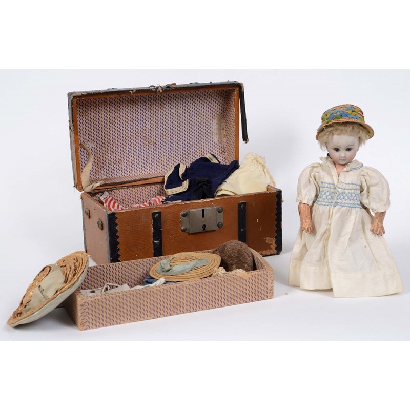 RARE JULES STEINER DOLL & DOLLS TRUNK a rare 19thc Series B doll, with fixed blue eyes, closed mouth and pierced ears. With a Motschmann body and squeaker mechanism, with composition arms and hands, and bisque legs and feet. Also with a 19thc dolls trunk and a variety of dolls clothing. Doll marked, Sie, B, 3/0, and written inside the head with the name Celestine. 9ins (23cms) high *The doll belonged to the vendors Mother Evelyn Bridget Shirley nee Phelps (1913-2001), who named the doll Celestine. She may have had the doll from her early years at Edgbaston, Birmingham, and when she was growing up in Five Ashes in Sussex. In the 1930's she was Assistant Stage Manager at the Old Vic in London, and during WW2 she worked for displaced people in Italy for the Red Cross. It is probable that the doll was given to Evelyn by her mother Ethel May Phelps nee Kitson (1874-1945), who was from Leeds originally.