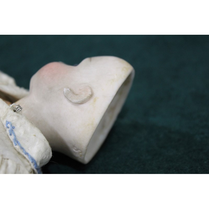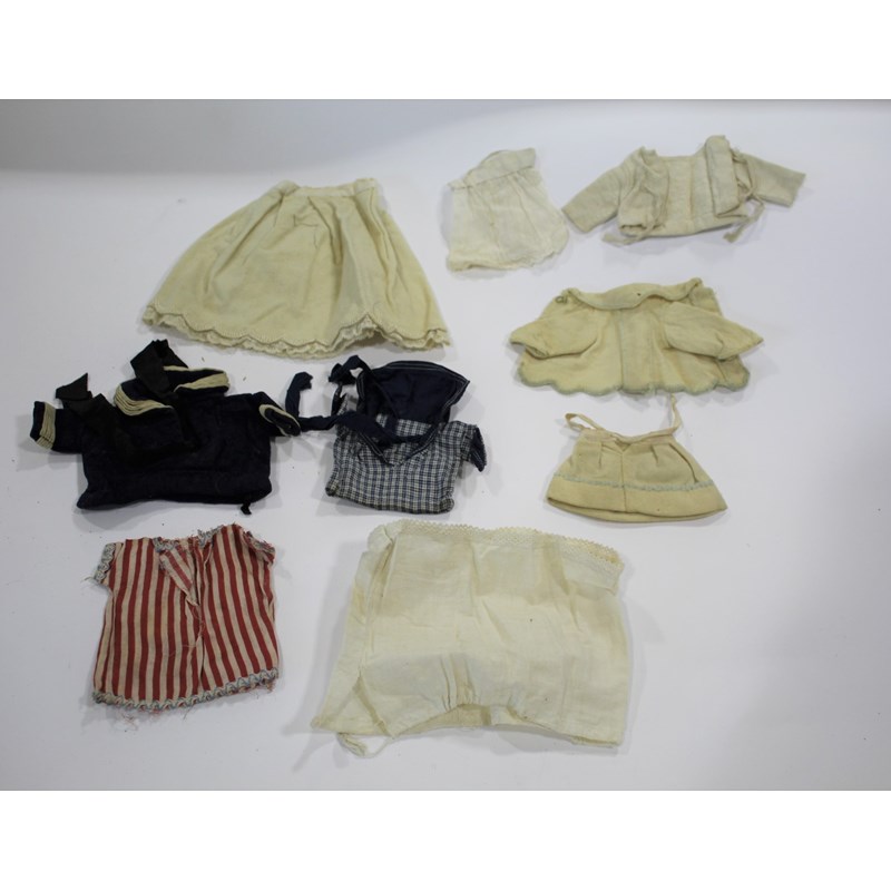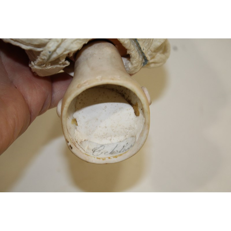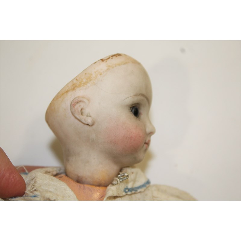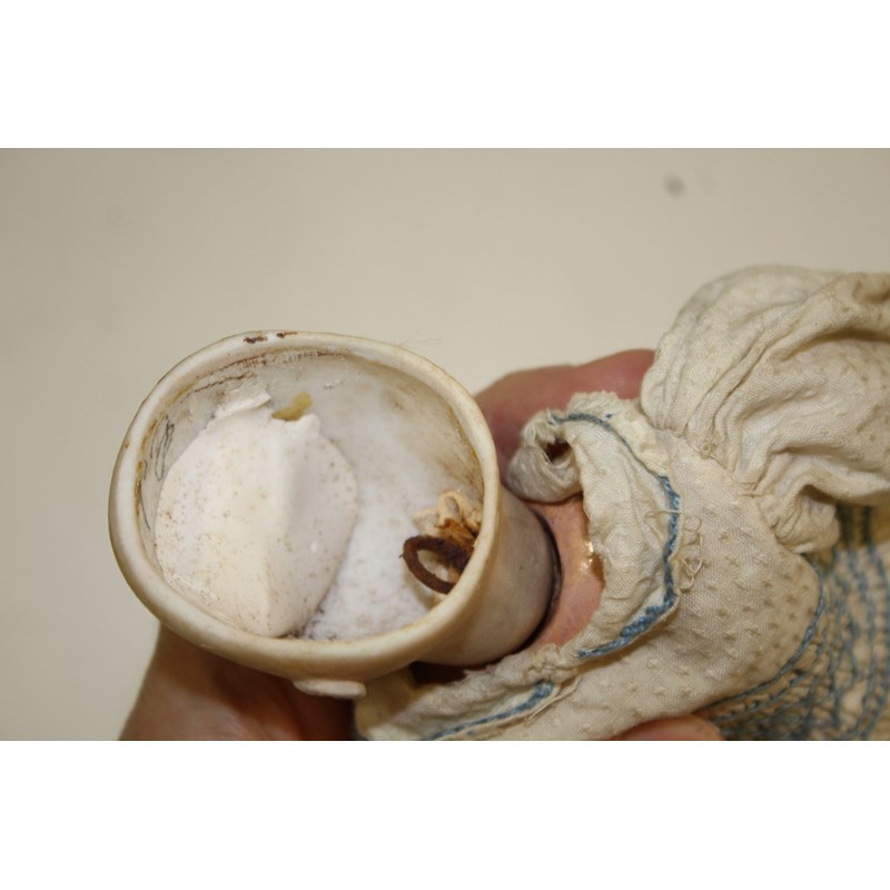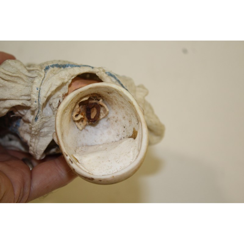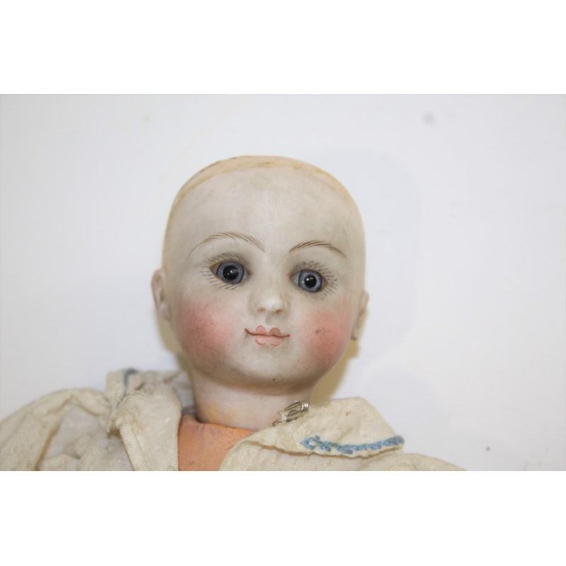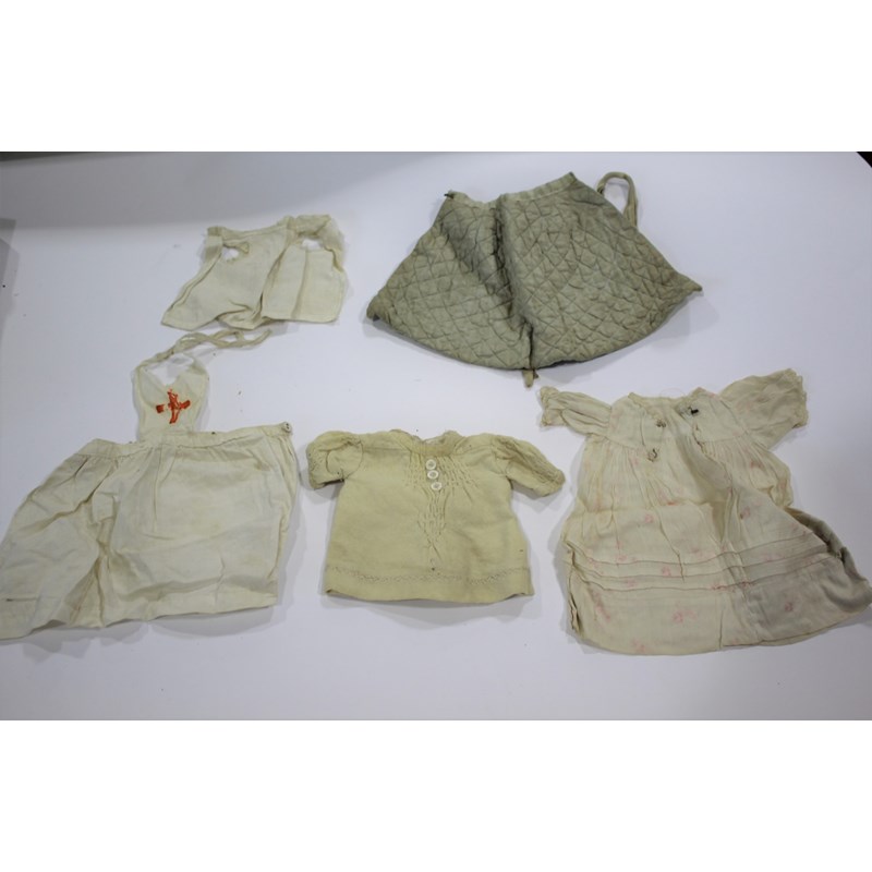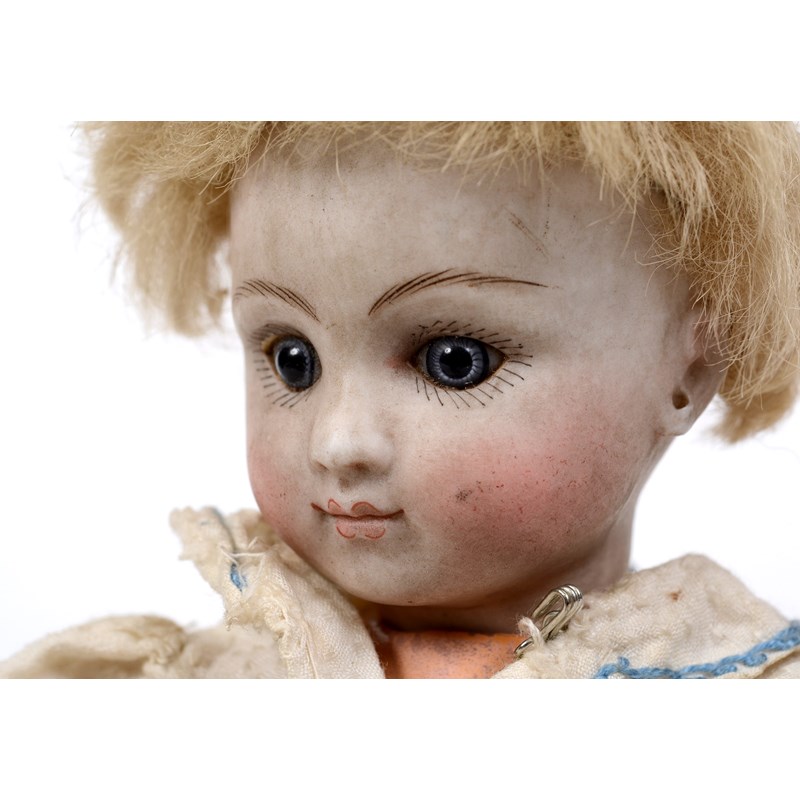 RARE JULES STEINER DOLL & DOLLS TRUNK a rare 19thc Series B doll, with fixed blue eyes, closed mouth and pierced ears. With a Motschmann body and squeaker mechanism, with composition arms and hands, and bisque legs and feet. Also with a 19thc dolls trunk and a variety of dolls clothing. Doll marked, Sie, B, 3/0, and written inside the head with the name Celestine. 9ins (23cms) high *The doll belonged to the vendors Mother Evelyn Bridget Shirley nee Phelps (1913-2001), who named the doll Celestine. She may have had the doll from her early years at Edgbaston, Birmingham, and when she was growing up in Five Ashes in Sussex. In the 1930's she was Assistant Stage Manager at the Old Vic in London, and during WW2 she worked for displaced people in Italy for the Red Cross. It is probable that the doll was given to Evelyn by her mother Ethel May Phelps nee Kitson (1874-1945), who was from Leeds originally.