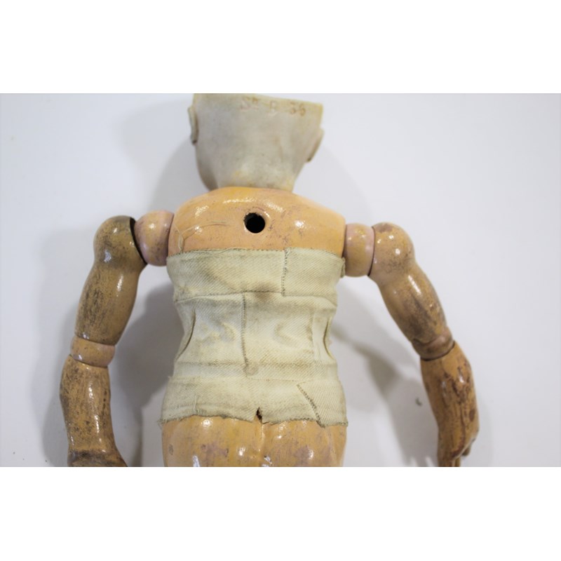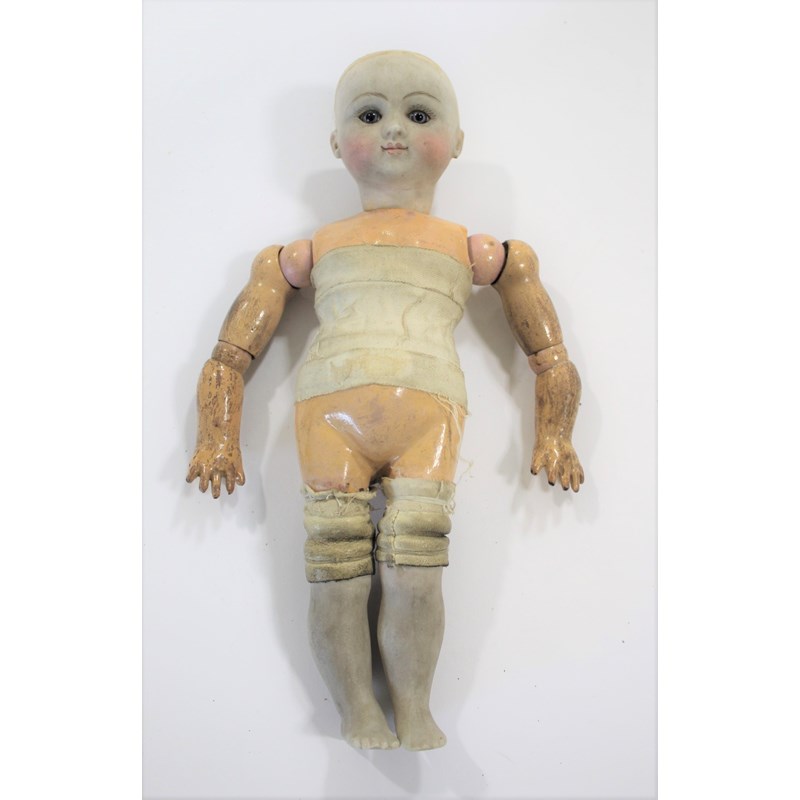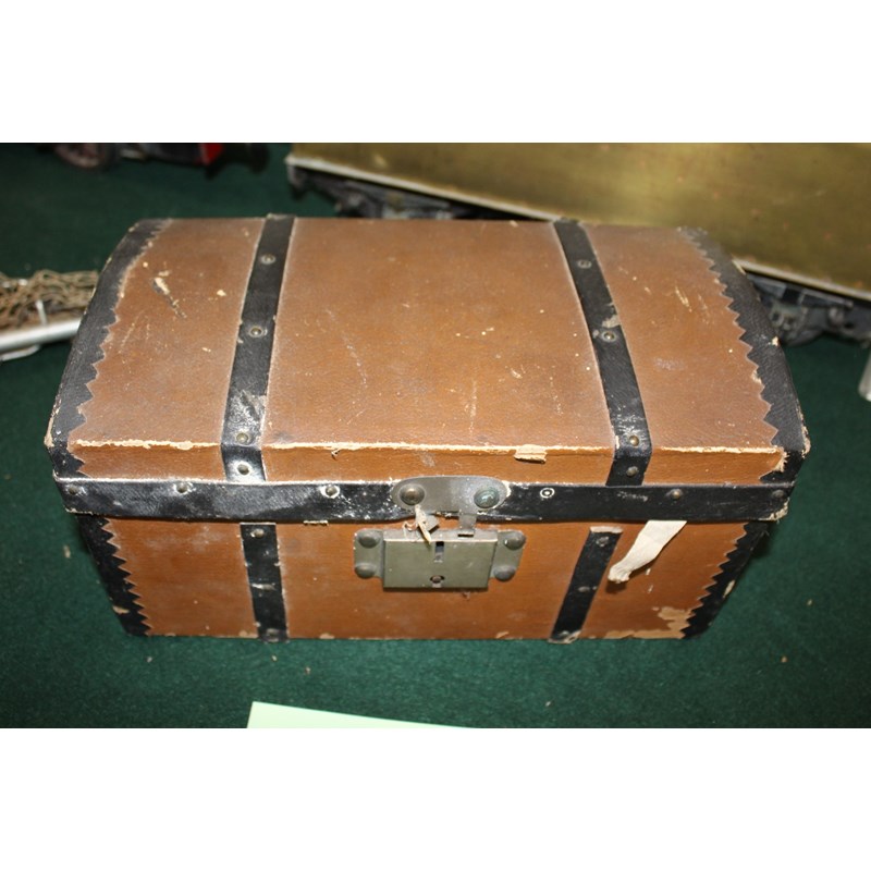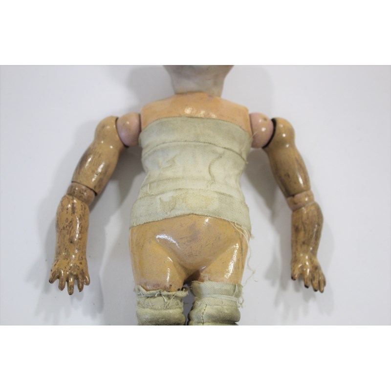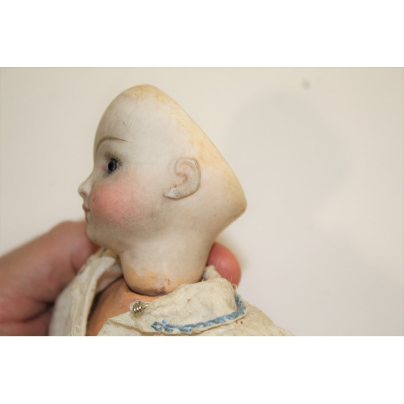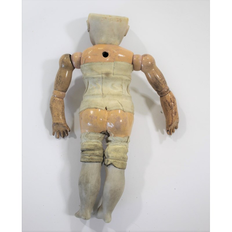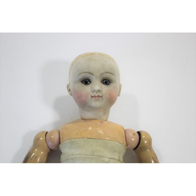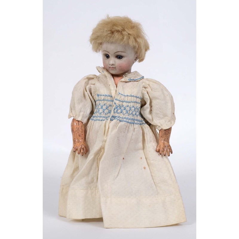 RARE JULES STEINER DOLL & DOLLS TRUNK a rare 19thc Series B doll, with fixed blue eyes, closed mouth and pierced ears. With a Motschmann body and squeaker mechanism, with composition arms and hands, and bisque legs and feet. Also with a 19thc dolls trunk and a variety of dolls clothing. Doll marked, Sie, B, 3/0, and written inside the head with the name Celestine. 9ins (23cms) high *The doll belonged to the vendors Mother Evelyn Bridget Shirley nee Phelps (1913-2001), who named the doll Celestine. She may have had the doll from her early years at Edgbaston, Birmingham, and when she was growing up in Five Ashes in Sussex. In the 1930's she was Assistant Stage Manager at the Old Vic in London, and during WW2 she worked for displaced people in Italy for the Red Cross. It is probable that the doll was given to Evelyn by her mother Ethel May Phelps nee Kitson (1874-1945), who was from Leeds originally.