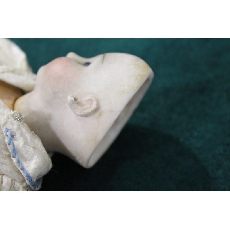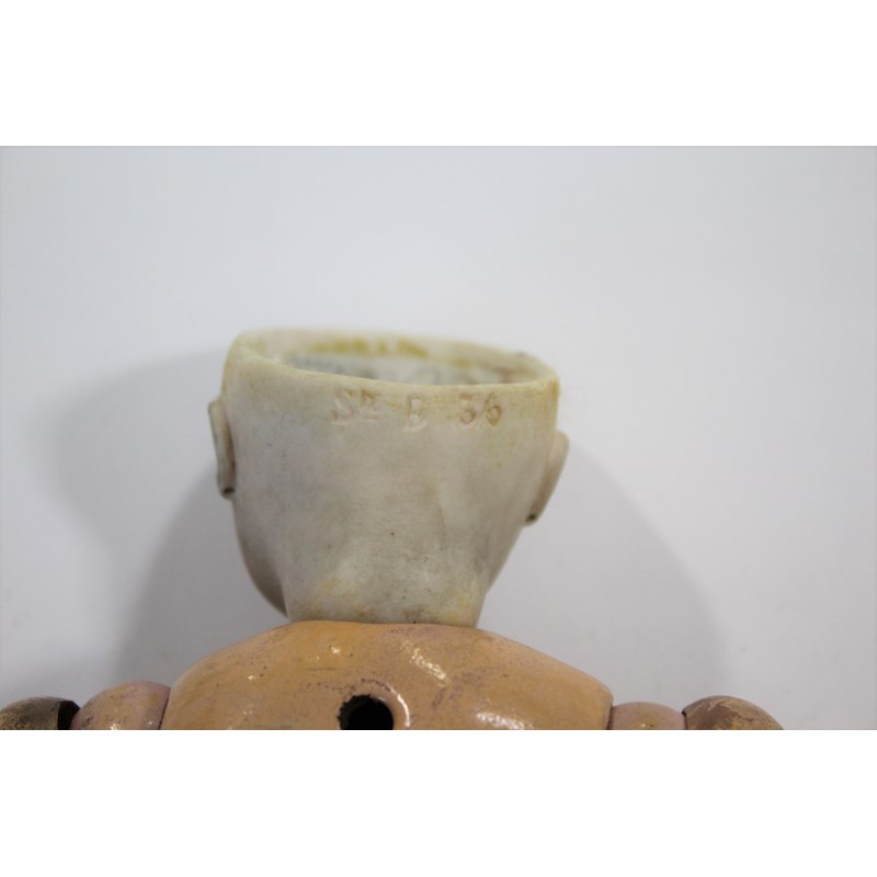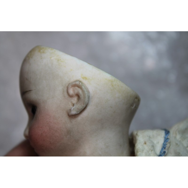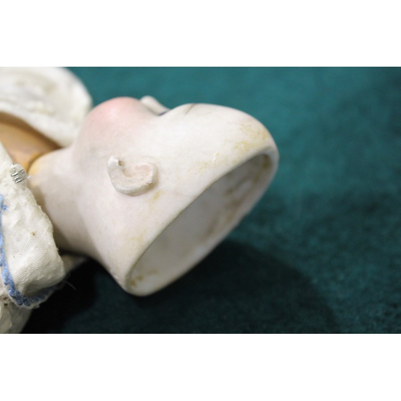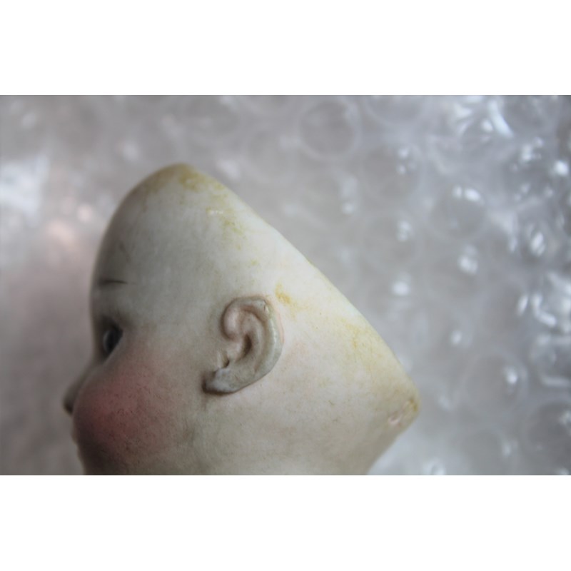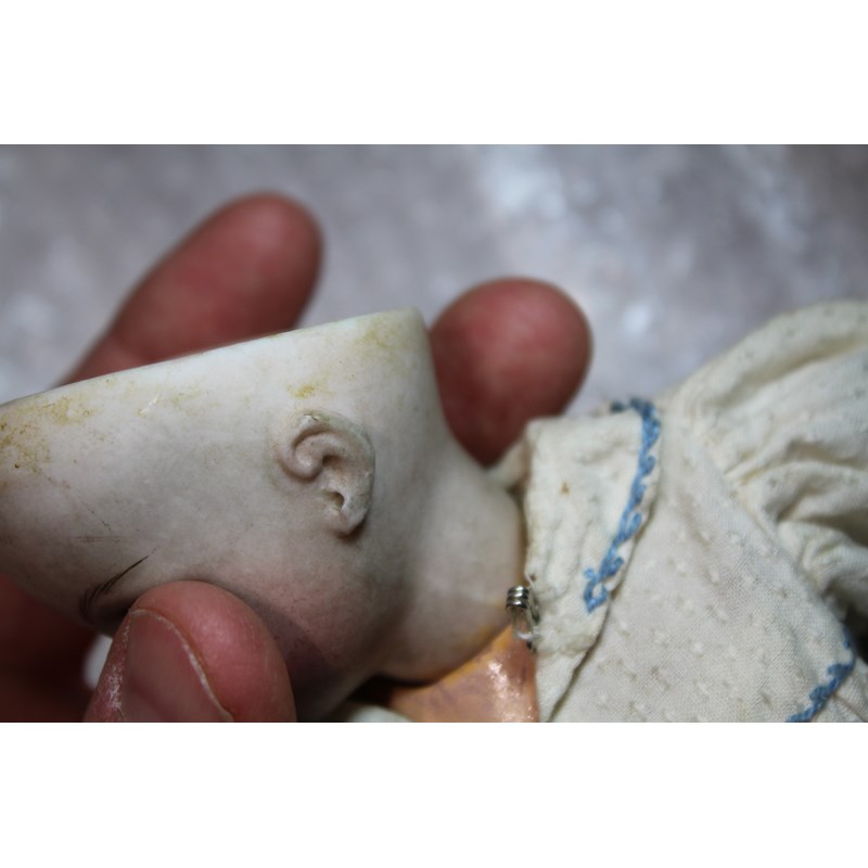 There is a small line above the right ear, which runs from the rim of the head towards the ear. It’s very small, around 0.5cm and very difficult to see on the images and in person. As you turn the head it sometimes disappears from view, so it is very feint. It could be a very feint hairline, or possibly done in manufacture. There is small chip to the left of the right ear (see image), the arms and hands are dirty and the feet are ok. It has been in the family probably since new, and has been untouched as you can see. The head is a little grubby and probably needs a very careful clean.