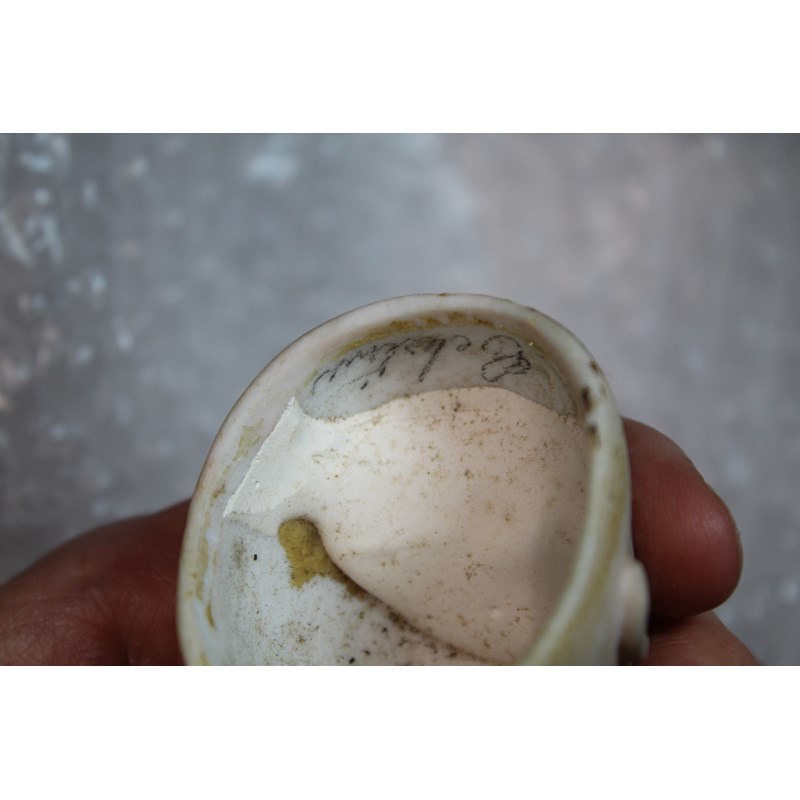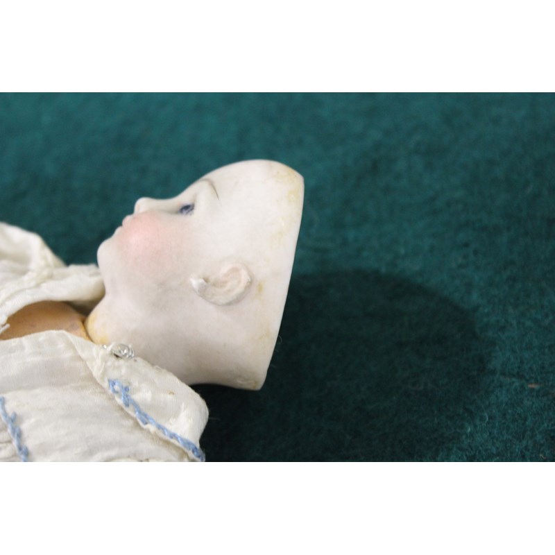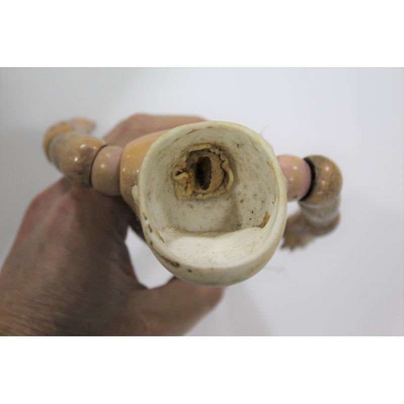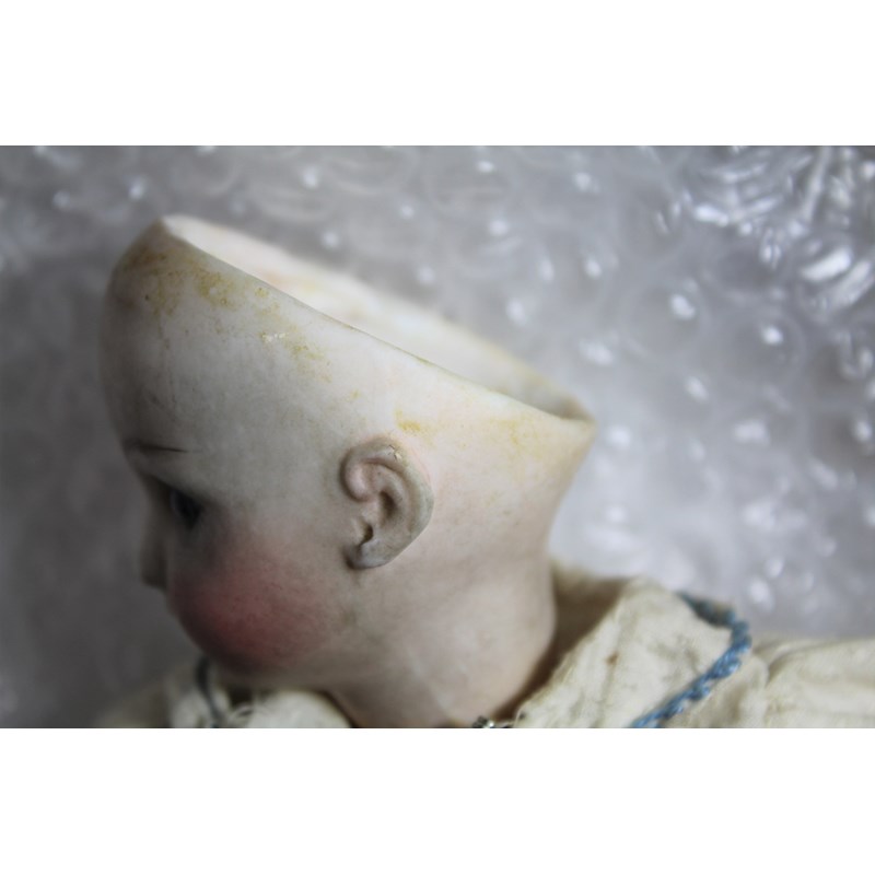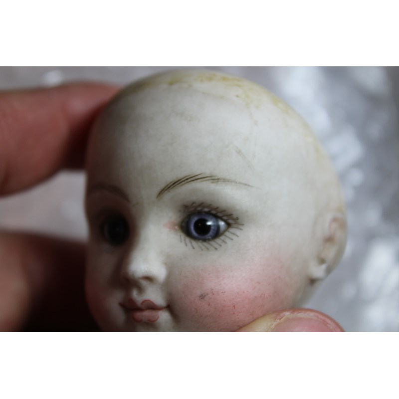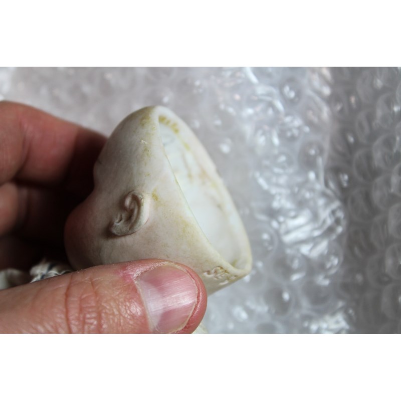 There is a small line above the right ear, which runs from the rim of the head towards the ear. It’s very small, around 0.5cm and very difficult to see on the images and in person. As you turn the head it sometimes disappears from view, so it is very feint. It could be a very feint hairline, or possibly done in manufacture. There is small chip to the left of the right ear (see image), the arms and hands are dirty and the feet are ok. It has been in the family probably since new, and has been untouched as you can see. The head is a little grubby and probably needs a very careful clean.