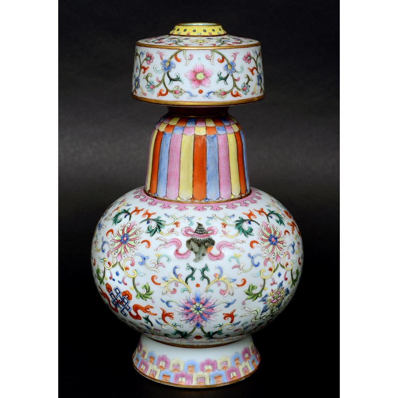 Benbaping, Jaiqing style mark, Republic Period, enamelled with scrolling flowers and the Eight Buddhist Treasures on a white ground, beneath a banded neck and drum shaped top, now glued to the base, iron red six character seal style mark, 26.5cm.