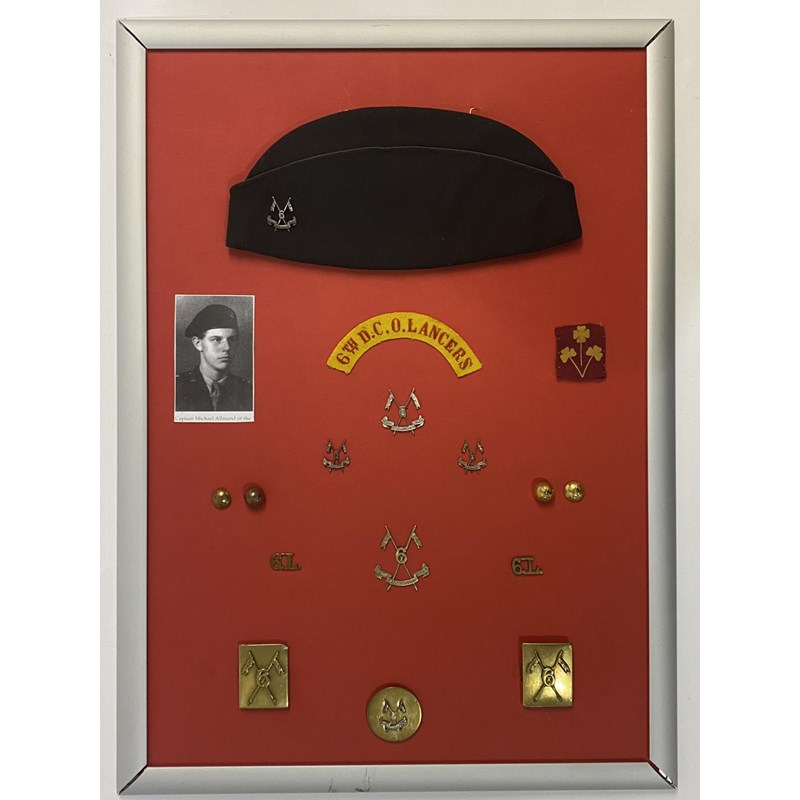 A FIELD SERVICE CAP AND INSIGNIA OF THE 6TH LANCERS. A folding field service cap with 6th Duke of Connaught's Own Lancers (Watson's Horse) badge and a selection of similar insignia including yellow and red shoulder title, buttons badges and other items to include two stirrup slides. 16 items mounted on a framed board.