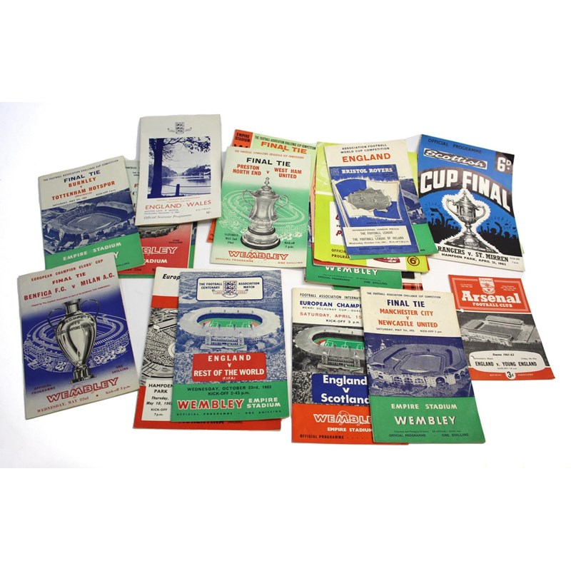 a qty of International and Club football programmes from the 1950's and 1960's, including Man City v Newcastle FA Cup Final 1955, Leicester v Tottenham 1961 FA Cup Final, Leeds v Liverpool 1965 FA Cup Final (and other cup finals), Benfica v Milan Wembley European Cup Final 1963, Atletico Madrid v Fiorentina 1962 Cup Final, England v Rest of the World 1963, England v Scotland 1961 and 1967, England v Wales 1963, Ireland v Gt Britain 1960, Bristol Boys v Stoke Boys 1963, and many more including programmes of Bristol City, Tottenham, Man Utd, Scotland and Ireland programmes etc.