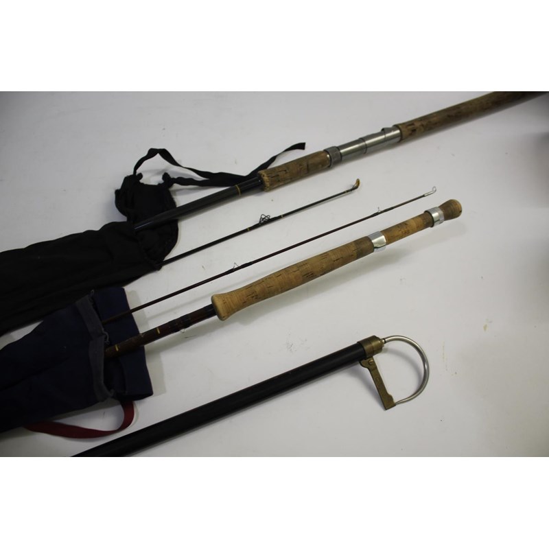 including a Bruce & Walker 9ft Companion two piece rod in Bruce & Walker bag, a Shakespeare Sigma Supra two piece graphite rod in Shakespeare bag, Masterfly MF100 Carbon Fibre two piece rod, Wessex Elite 9ft two piece rod, Wessex Spinning 8ft two piece rod, and other rods including attached Mitchell 756 reel. Also with accessories including Hardy gaff.