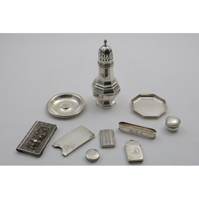 A late Victorian vesta case engraved with a penny piece on one side & "24th May", and the portrait of a smoker on the other, a sugar caster, a Chinese filigree card case, another card case, initialled, a reeded vesta case, a stamp case, a napkin ring, initialled, two small boxes and two pin dishes; the caster 6.6" (16.8 cms) high; 13.3 oz (11)