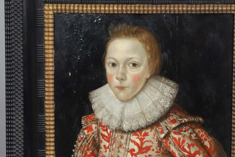 The sitter in this portrait may not be immediately familiar but he was born to be King. “He is Henry Frederick, Prince of Wales, the eldest son of King James I, who was also James VI of Scotland. We see him here as a child, perhaps seven or eight years old, wearing a richly brocaded tunic, a garment so favoured that it is shown in other portraits of him, looking boyishly innocent but yet alert and eager. A large hat is visible under his left arm, as though he may be preparing to go out His cheeks show the rosy tint of cherubic innocence but they also indicate the good health that was by no means a guarantee afforded even to an heir apparent. The artist is an unknown hand working closely in the style of Robert Peake (c.1551-1619). Peake himself bore the title of `Picturemaker` to the Prince. Tragically, Henry succumbed to typhoid fever in 1612, aged just 18.
