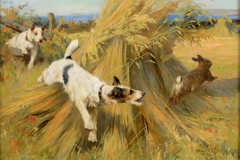 An auction record of £6100 was paid for a large (156 x 120cm) watercolour by contemporary artist Sarah Graham whilst a much smaller oil by Mary Fedden, just 19 x 24cm, had been bought direct from the artist’s studio in 1995. This also doubled hopes to make £7560. The day’s top price was paid for a lively, high-spirited oil on canvas by Arthur Wardle, entitled `The Chase is better than the Catch`, depicting two terriers chasing a hare around corn stooks. Full of vigour and with a delightful balance of playfulness and determination, this 37 x 52cm picture – consigned for sale from Northern Ireland - was bid to £11220 after much interest from bidders in Britain, America and Australia.