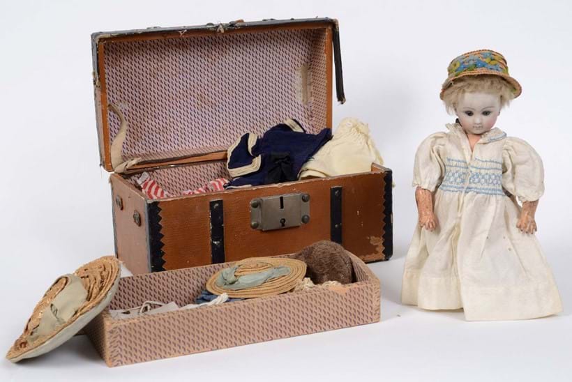 In the selection of Collectors’ Items, highlights were again intriguing for their remarkable range and variety. A framed banded sampler, worked in 1669 and decorated with alphabets and floral motifs, made £1520; a walking cane made from a carved narwhal tusk strode to £2250; a Moy & Bastie patent cine camera, 45cm high and long pre-dating the slim convenience of a modern smartphone, flashed up to £3050; eleven bottles of Chateau Cheval Blanc, 1986, lifted spirits at just over £3000 as did a bottle of whisky from a limited edition made by the Brora Distillery in 1977 when it made £1090. A signed Snaffles print, entitled `Handing it out to `em`, showed a surprising return to glory days at £1070. Two particular delights involved clothing: a small pair of cream leather shoes made by Henry Weiss of St Petersburg were believed to have been worn by Grand Duchess Marie Nikolaevna of Russia (1899-1918). Tragically, she was slaughtered with her family at Ekaterinburg in 1918. These little shoes, a nostalgic glimpse of Tsarist Russia, made £5970. Finally, a very rare Jules Steiner doll with a trunk of clothes came from Evelyn Shirley’s childhood and might have been a gift from her mother, Ethel, in about 1915. The `B Series` doll with a Motschmann body (23cm high), named `Celestine` by her young owner all those years ago, and was bought for just over £10,900.