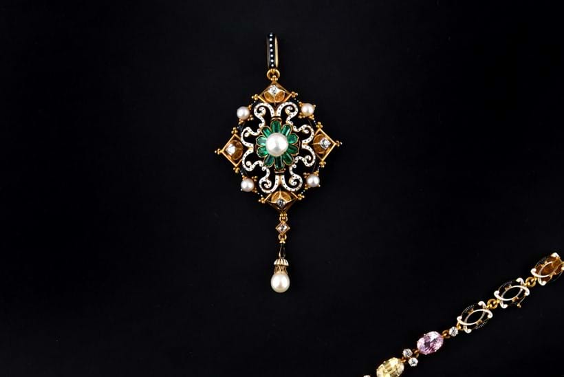 The sale's highest prices were saved for the last two lots: an enamel and gem set pendant by Carlo Giuliano and a gem set and enamel bracelet by Carlo & Arthur Giuliano. Carlo Giuliano (c.1831-1895) moved to London from Italy in about 1860 and set up in business with Alessandro Castellani in Frith Street in Soho. By 1874 his two sons, Carlo Joseph and Arthur Alphonse, had joined him in the business and they opened a new shop at 115 Piccadilly. Giuliano’s jewellery was inspired by the Renaissance and ancient Egypt, usually decorated with polychrome enamels and coloured gemstones. Both pieces doubled their top estimate to make a combined total of £28,125.