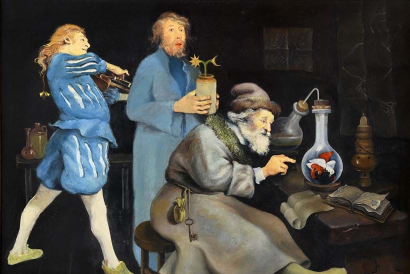 The penultimate lot in the sale made the highest price: an inventive but eccentric depiction of `The Alchemist` by Robert Lenkiewicz featured a portrait of the artist himself standing in the centre. The large subject, 91 x 120cm, refers to Lenkiewicz’s love of the history of science and medicine, the pursuit of knowledge down the centuries and the focused determination of a scholar’s passion. Dated to c.1968 by the artist’s son, the picture attracted phone bidders and online activity to make just over £9300.