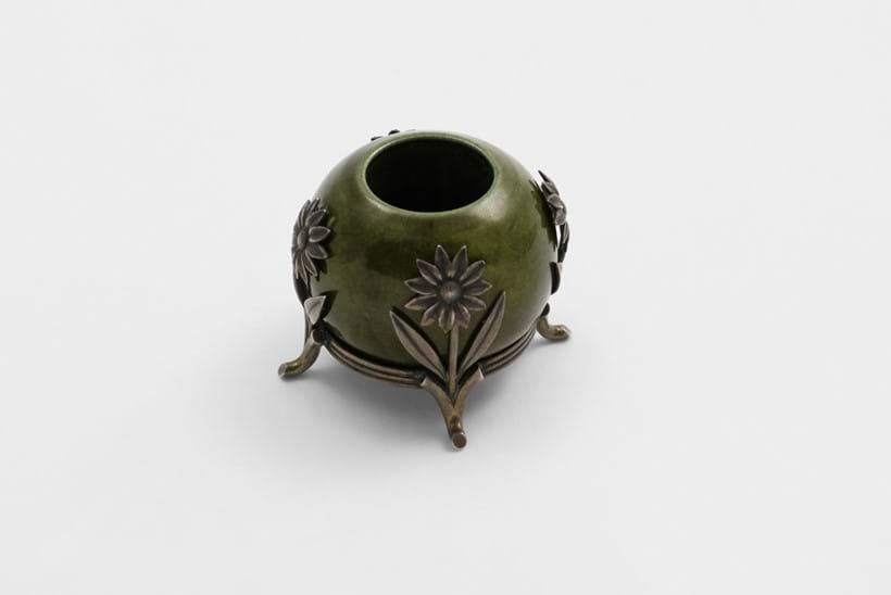 Two small historical pieces also exceeded expectations: a Charles II porringer, 1677, from Chambers Court in Gloucestershire, realised £2750; and a rare Commonwealth beaker by William Harrison, 1651, made £6875. But big prices were also paid for small treasures: A 1.5” 18ct gold Victorian vinaigrette with floral scrolls on the grille, 1852, made £2125 and a George III "Trafalgar" vinaigrette, rectangular with a portrait of Admiral Nelson and "ENGLAND EXPECTS EVERY MAN WILL DO HIS DUTY" on the cover, the grille with H.M.S Victory in low relief and "TRAFALGAR OCR. 21.1805", just 1.2” long, made £3500. Finally, there was a great surprise for a lucky vendor in Wales: a small late 19th century Russian green-glazed pottery stand or holder of globular form, with a reeded circular base and four supports each in the form of a daisy flower, was made by the notable Karl Faberge in Moscow, c.1887-1900. This soared above its £600-800 estimate to make £10,625.
