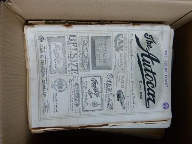 Examples include: The British Engineer, The King's Highway, Autocycle, The Motorcycle. Light Car, The Motorist, The Motor News, The Car Illustrated, Automotive Digest, La Vie Automobile, Omnia, Morris Owner, The Car, Motorcycle Trader, Motor Age, The Autocar and many more. Various conditions, but an interesting archive. Also, a large bound volume of Motor Technical Records a splendid bound book of printed sheets of veteran and vintage car details. (2 boxes)