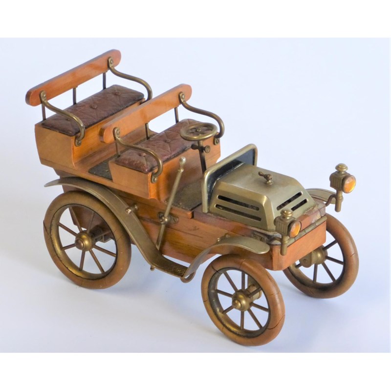 A well-constructed piece from nickel-plated brass, wood, leather and rubber, depicting a veteran car in the guise of a side-entrance tonneau-bodied vehicle, the bonnet hinging to reveal space for matches, and the seats hinging to reveal a place for cigarettes Nicely detailed with candle-powered lamps, leather seats, rubber-tyred spoked wheels and a working handbrake. 18-cms long, 13-cms high.