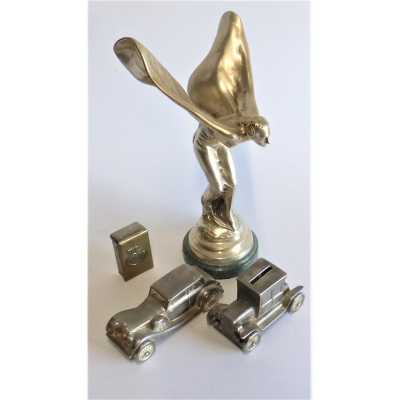 both nickel-plated, one example being a money box. Also, a dashboard mounted vesta box holder, a promotional item by the Car Illustrated magazine, probably dating c1905 and a modern 29cms high Rolls-Royce showroom emblem of poor quality. (4)