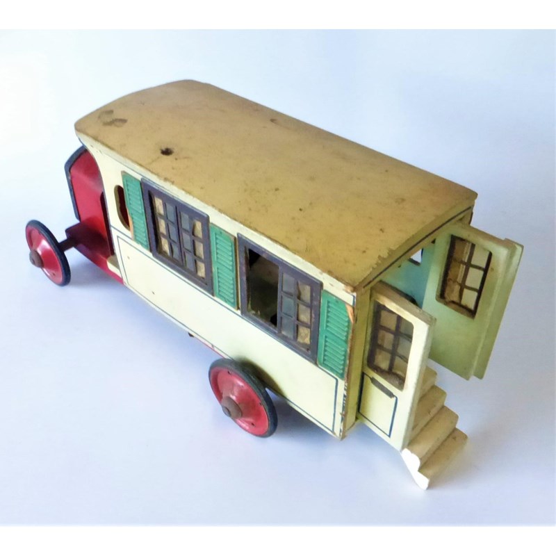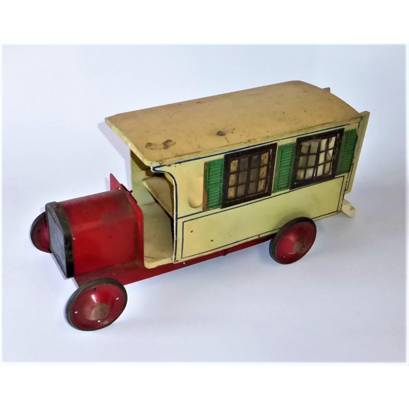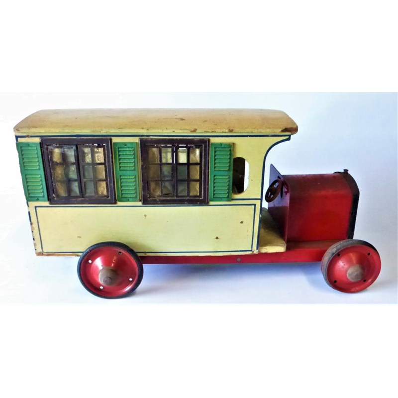 A rare floor toy, being a cross between a vehicle and a doll's house. It possesses its original furnishings and windows. Tri-ang's early vehicles in the late 1920s were described as 'Doll's Motor Vans' having an open-front cab design to create an easily accessible driver's space that was a perfect place for a child to put a doll or small teddy bear. The sides of the caravan have opening windows (apparently the same window parts used in some of their doll houses), and the back of the vehicle has two opening 'French Window' doors, together with a set of steps that can be moved into place when the doors are open. The chimney is missing but the electric lighting facility is insitu. Two windows need re-fitting. 18-inches long, 8-inches wide.