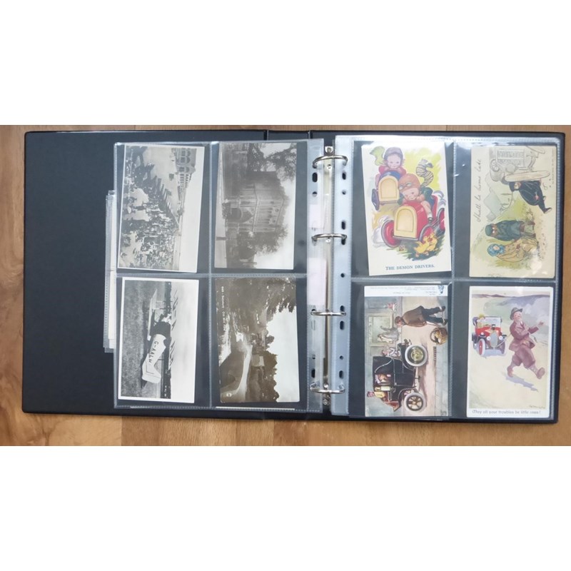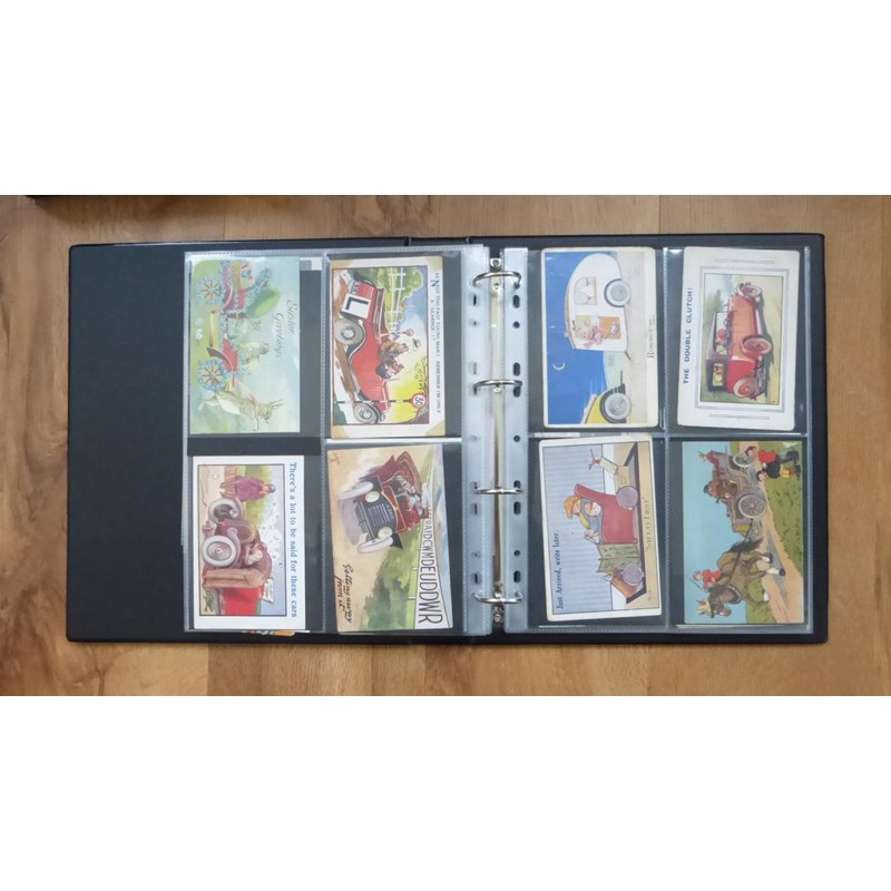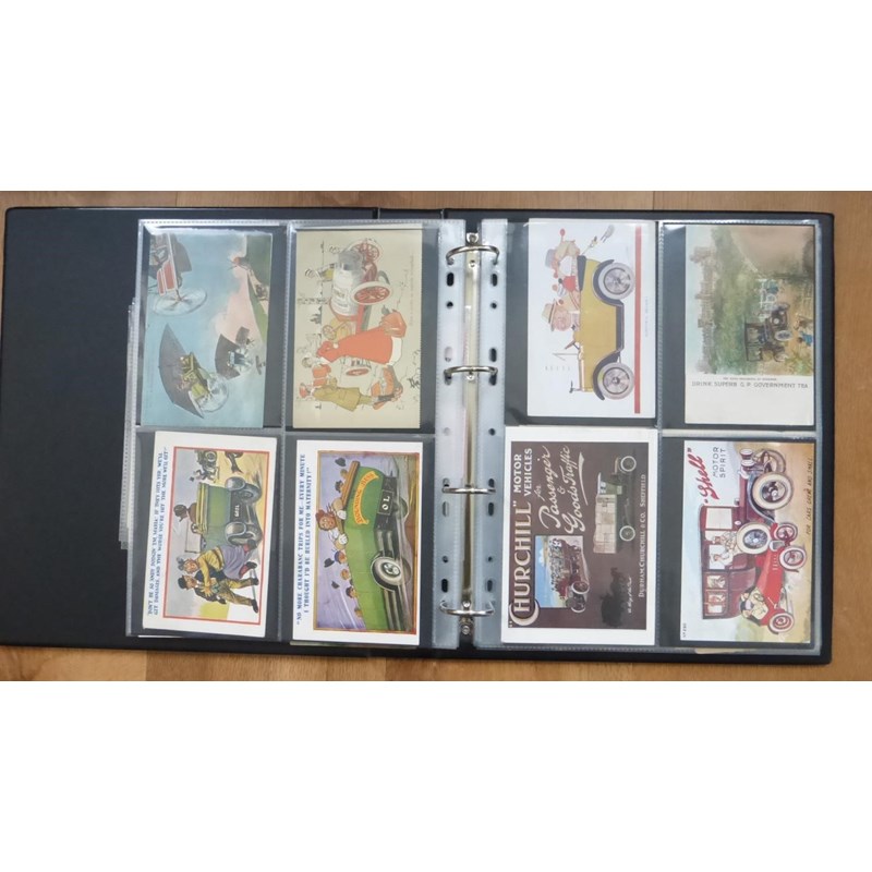 A superb collection held in a folder with a slipcase, all representing transport in some way. They range from humorous images, artistic views, McGill-style saucy postcards, risqué couples, studio images, children in cars, Easter and Birthday greetings, various street scenes, some advertising cards, some embossed, garage scenes, several reproductions, but the majority are original. Circa 140 cards, most in very good condition. See also lot 444.