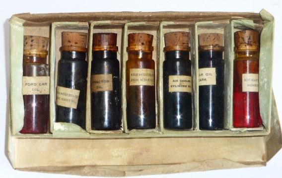 An unusual set of 3-inch glass bottles, each containing a different oil, Ford Car Oil, Tractor Oil, Air Cooled Cylinder Oil, Best Heavy Russian Mineral Oil, etcetera. Each of the seven bottles housed in a partitioned box, itself in need of restoration. Possibly a representatives sample set, certainly interesting and rare.