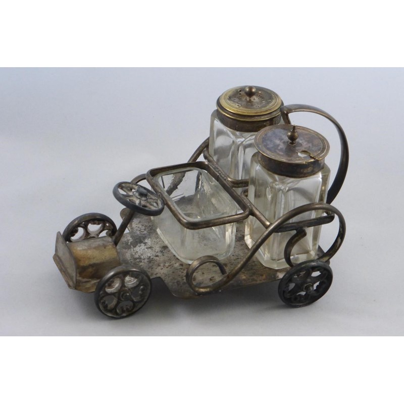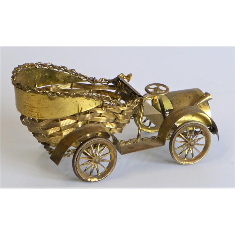 in the guise of a motor-car, having a nickel-plated on brass frame and glass fittings. Also, an unusual brass basketweave-style sweet dish, possibly missing its glass liner. 17 and 13-cms, respectively. (2)
