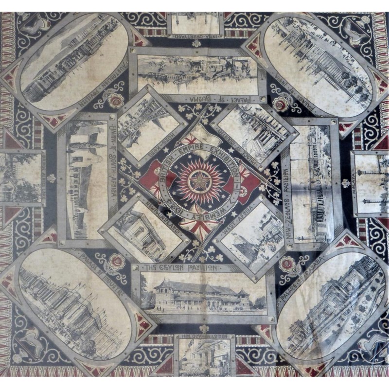 A large commemorative handkerchief, with a star and sunburst centre within a circle titled 'British Empire Exhibition, Wembley 1924', enclosed by various buildings entitled 'Palace of India', 'Australian Pavilion, New Zealand Pavilion' and fourteen others, 88 x 88 cms, framed and glazed, some damp staining.
