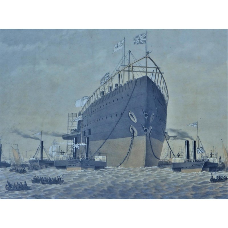 'The Leviathan at her Moorings off Deptford', a Victorian colour lithograph by McGaire, 60 x 44 cms; a rare German late 19th century lithograph, 33 x 41 cms, and four other prints relating to the Great Eastern, all 20th century, all framed and glazed (6)
