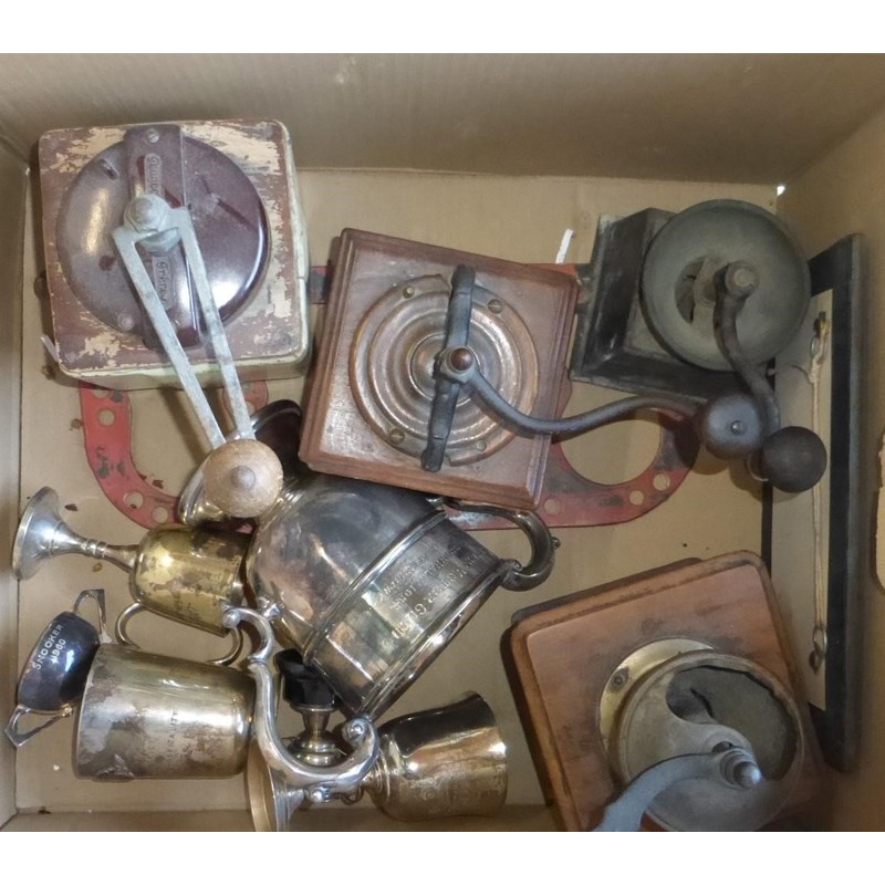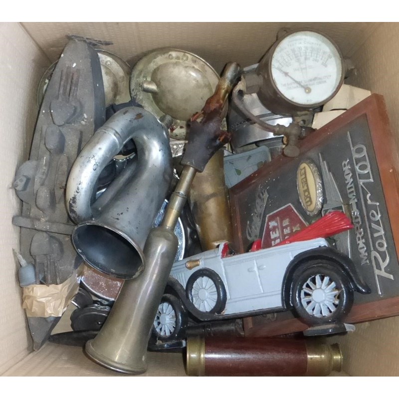 to include several bulb horns, Morris under-bonnet oil can and holder, Pratts petrol can, piston award, Peugeot-manufactured coffee grinders, EPNS trophies, etcetera. (2)