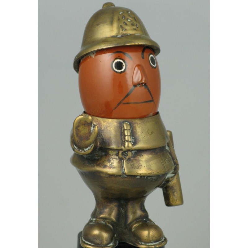 A policeman accessory mascot, designed by John Hassall in 1912, with a bronze body and moveable brown porcelain head with painted features, signs of original nickel-plating, dual-threaded mounts and Rd 511941 engraved on the base. 4¼-inches (13cms) high, mounted, signed by the artist This example is in good condition with a tight porcelain but moveable head, Hassall engraved on the front, display-mounted. 13cms high.