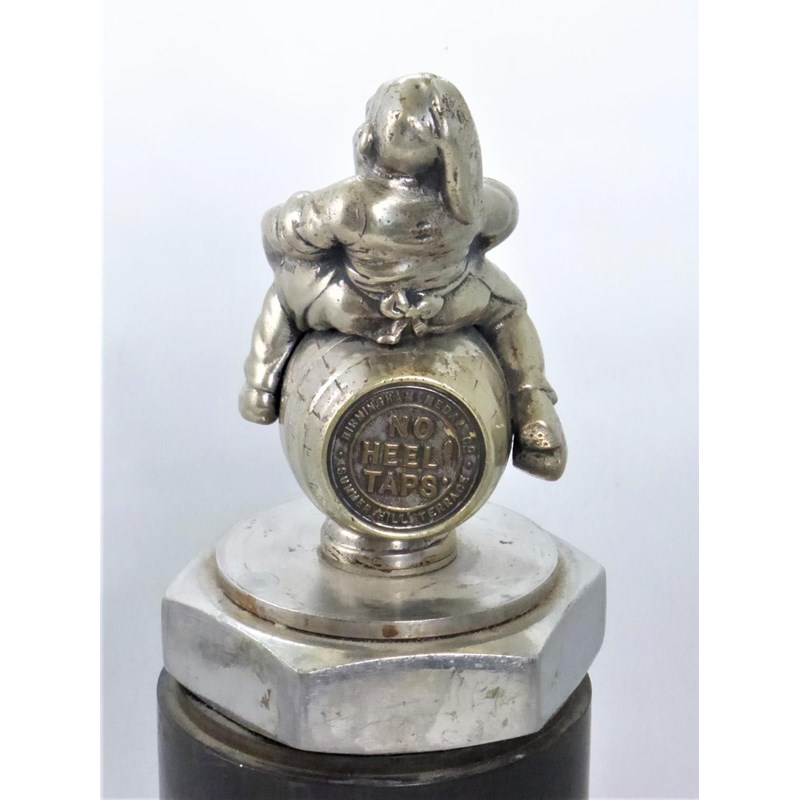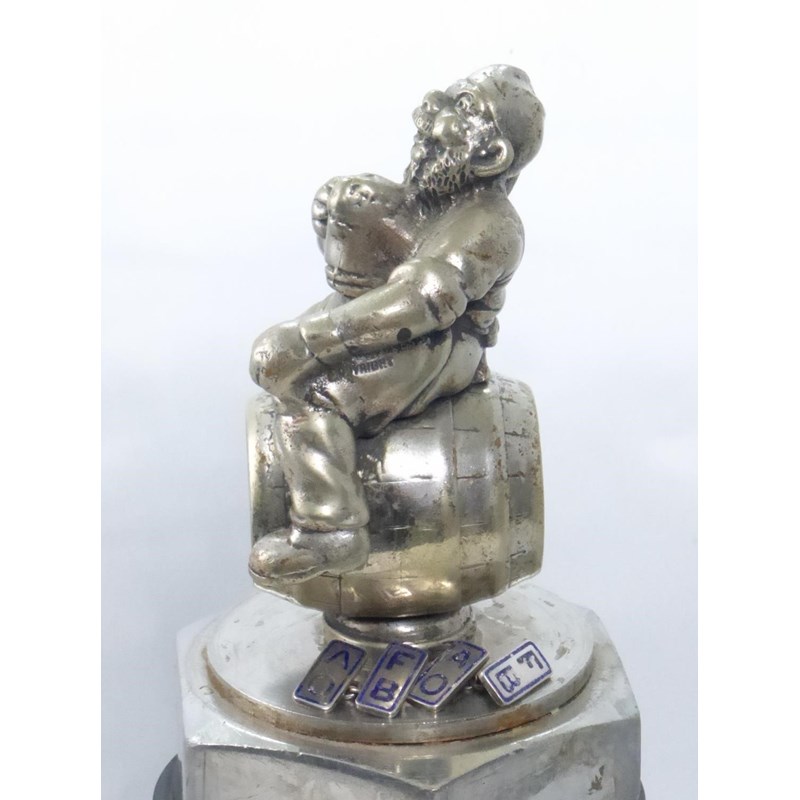 This rarely offered mascot represents a charitable organisation, its maxim being, 'To foster the noble Art and gentle and healthy Pastime of froth blowing amongst Gentlemen of-leisure and ex-Soldiers'. Founded by Ronald Frothington charities, Noble, an ex-soldier and merchant, in 1922, initially with the object of raising £100 for the children's charities, one of the Order's first meeting places was the Swan at Fittleworth, West Sussex. By 1928 the charity had raised £100k, yet folded in 1931 on the death of the founder. The manufacture was the Birmingham Medal Co., which is shown intaglio on the rear of the barrel, nickel-plated with original blue A.O.F.B enamel to the front. Currently mounted on a commercial vehicle radiator cap, coming with the mascot are a pair of A.O.F.B enamelled cuff-links, which were given to every member on enrolment. Display-mounted, the mascot 12cms high. (3)