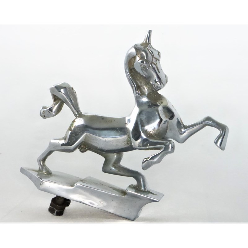 Art-deco 'Imperial Horse' mascot, as originally fitted to Humber Pullman and later Imperial motor-cars. Chromium-plated, the rearing horse with striking features, mounted on a stepped dais. Late 1930s, 14cms high.