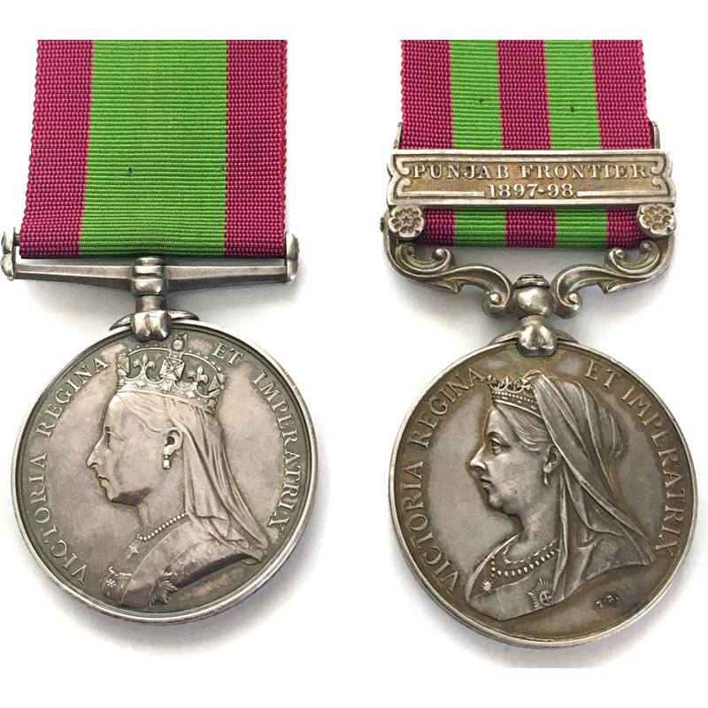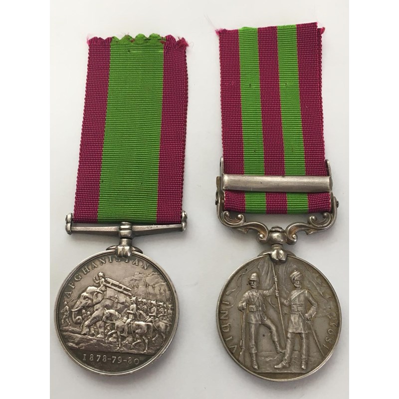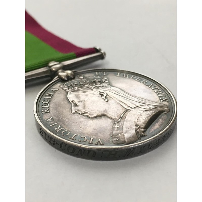 An Afghanistan 1878-79-80 Medal named to Sub.Con: H. Myland Ord: Dep with an India 1895-1902 Medal with Punjab Frontier 1897-98 clasp, named to Captn H. Myland, Ordce Dept. BI. Henry Myland had a long and successful military career, a Private with the Cape Mounted Rifles from 17th March 1863, he rose to Corporal, Sergeant and then Colour Sergeant before transferring to the 96th Regiment in India from the 1st of May 1970, clearly problems arose as he was tried and reduced to Private within a year. He rose again to Sergeant in the Ordenance Department in Bengal having served with the 40th Regiment and time on the unattached list. He rose through the ranks to sub Conductor, Conductor, Honorary Lieutenant, and finally Captain. He dies on the 18th December 1897 in Calcutta from the effects of illness picked up while serving with the Malakand Field Force.