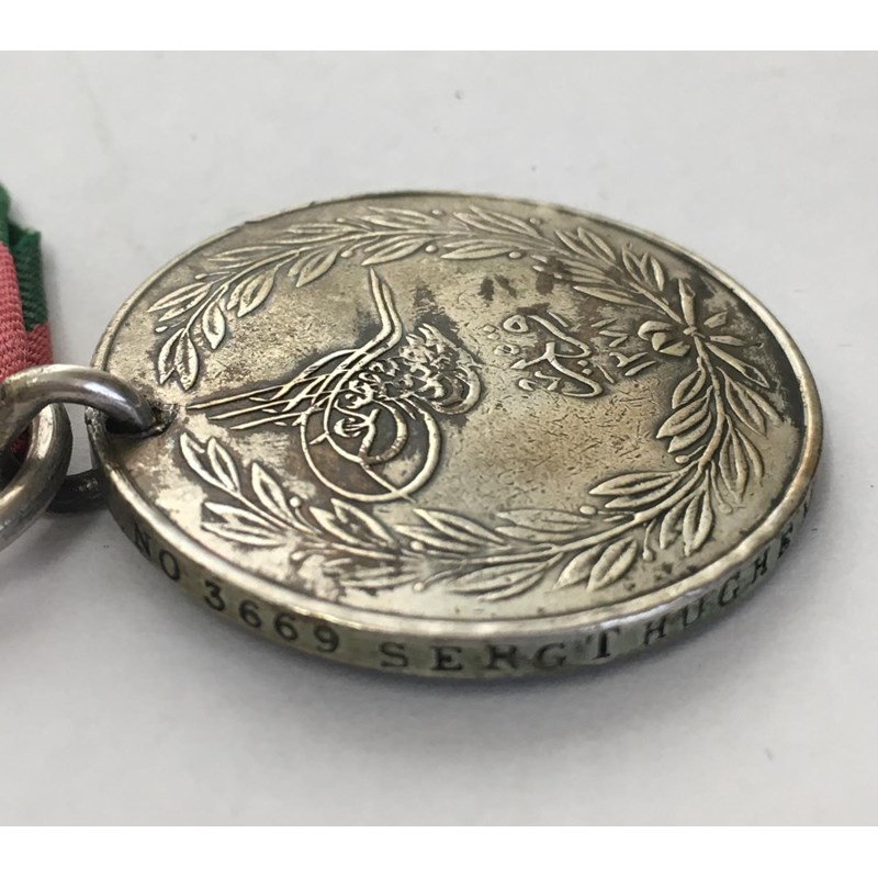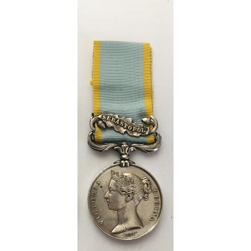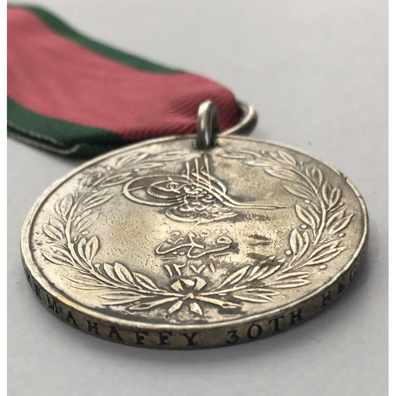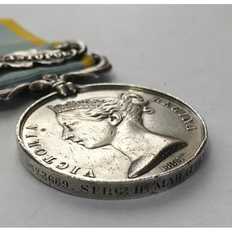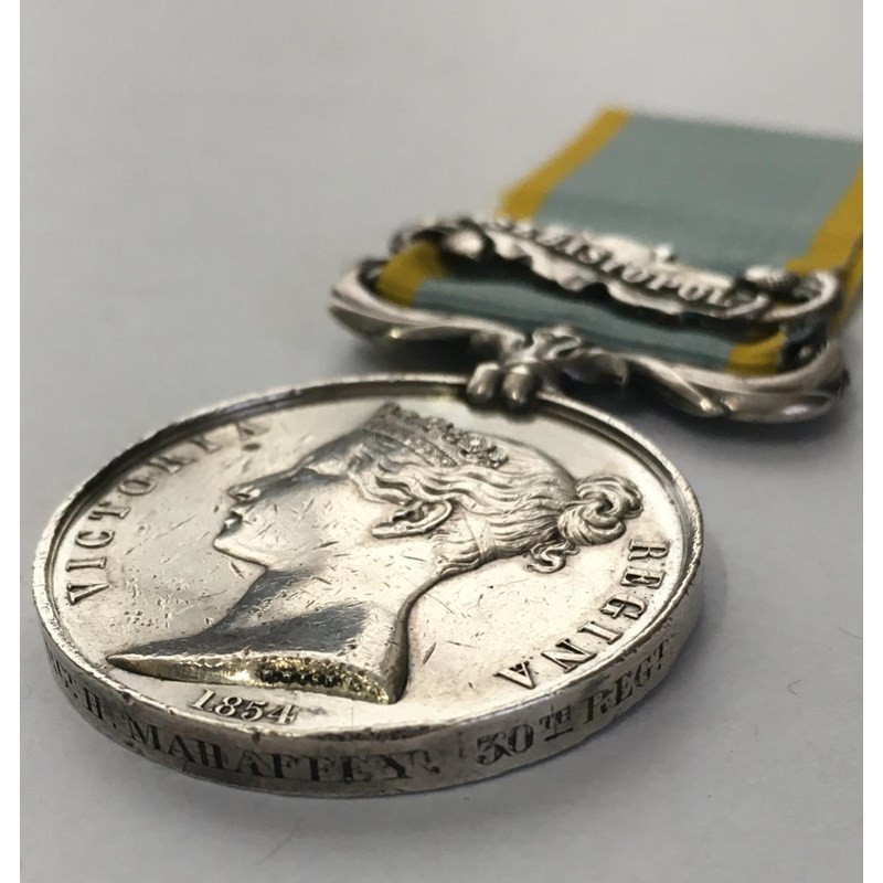 A Crimea War Medal with Sebastopol clasp named to 3669 Sergt H. Mahaffey 30th Regt and a Sardinian type Turkish Crimea Medal named to 3669 Sergt Hughe Mahaffy 30th Regt. Hugh Mehaffey (also Maheffey, Mehaffy or Mahiffy) was born in Monaghan, following work as a shoemaker he enlisted in the Glasgow District as a Private with HM 30th regiment on 2 November 1853 with number 3669. Corporal from August 1855 and Sergeant from November 1856 he was discharged June 1865. He saw service in Ireland, the Crimea, Canada, Jersey and Gibraltar. Records suggest that he was wounded on the 8th September 1855 during the final attack on the Redan, 30th Foot Cambridgeshire Regiment had casualty figures of 43 killed and 112 wounded. Sold with photocopied research.