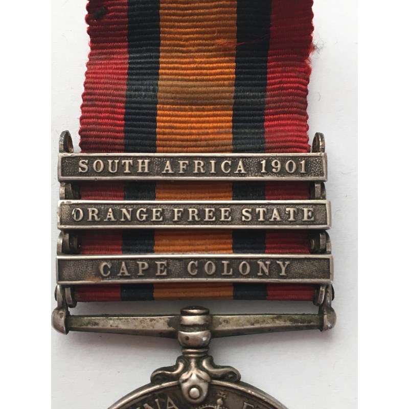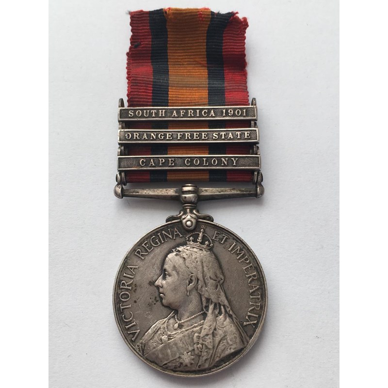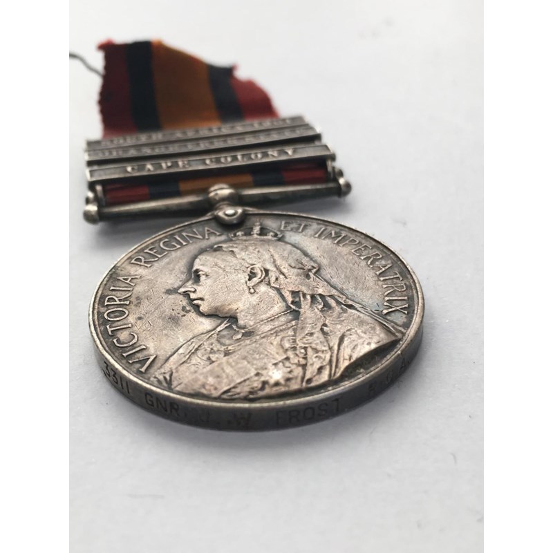 A Queen's South Africa Medal with clasps for Cape Colony, Orange Free State and South Africa 1901, named to 3311 Gnr J.W.Frost R.G.A. John William Frost, who was also entitled to the 1902 clasp, was born in 1878 in Stockton on Tees, he attested for the Royal Garrison Artillery on 23rd April 1900, already a member of the 4th Battalion Norfolk Regiment, initially with a Short Commission that was extended to eight and then 12 years. Sold with roll extracts and copied record of service.