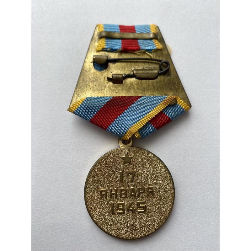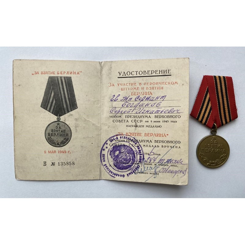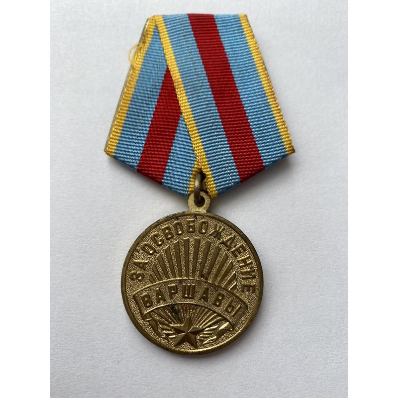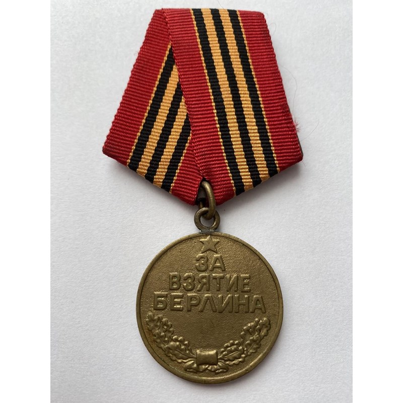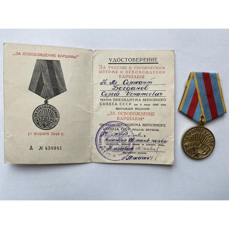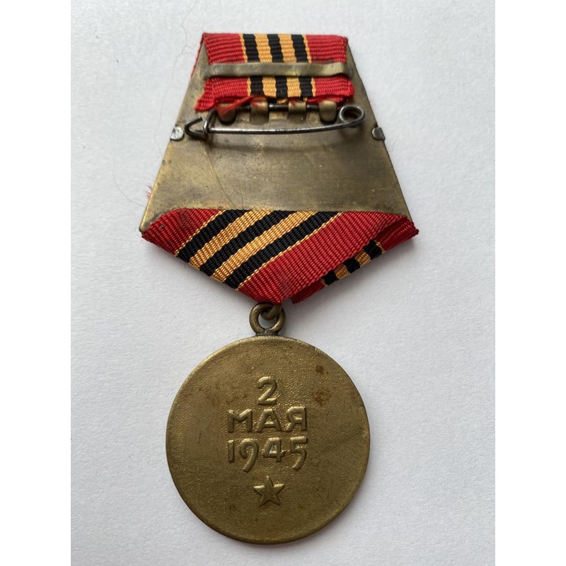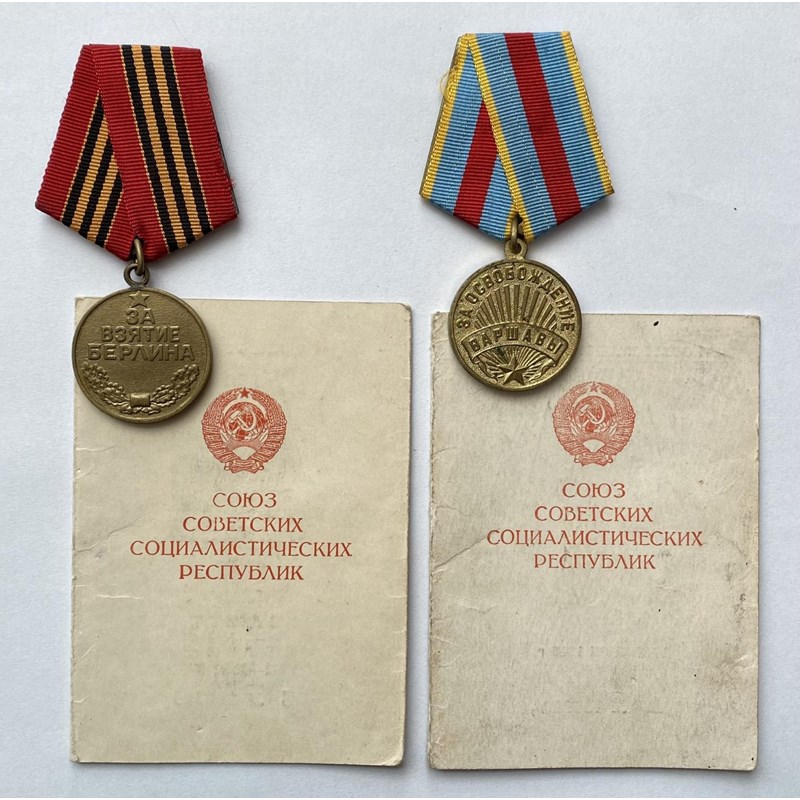Comprising a Russian Medal for the capture of Berlin awarded to those Russian soldiers who took part in the capture of Berlin from 22 April and 2 May 1945 and the medal for the liberation of Warsaw awarded to Soviet personnel who took part in the liberation of Warsaw between 14th and 17th January 1945. The accompanying award cards numbered 135858 and 434941.
