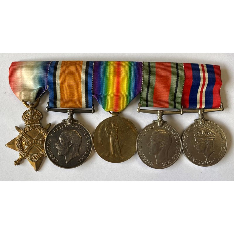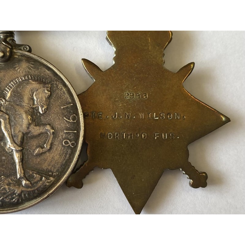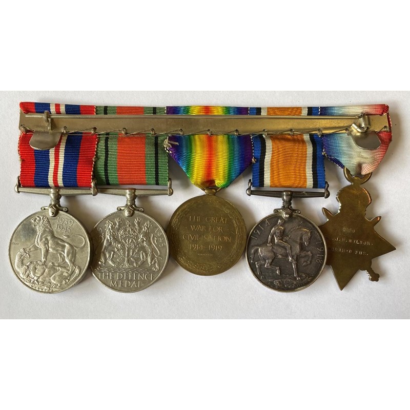 A group of five comprising 1914-15 Star named to '2956 Pte J.N. Wilson North'd Fus', War Medal and Victory Medal to Wilson as acting sergeant, and Second World War Defence and War medals. Private John N. Wilson was later promoted to acting Sergeant in the Northumberland Fusiliers. Mounted as worn.