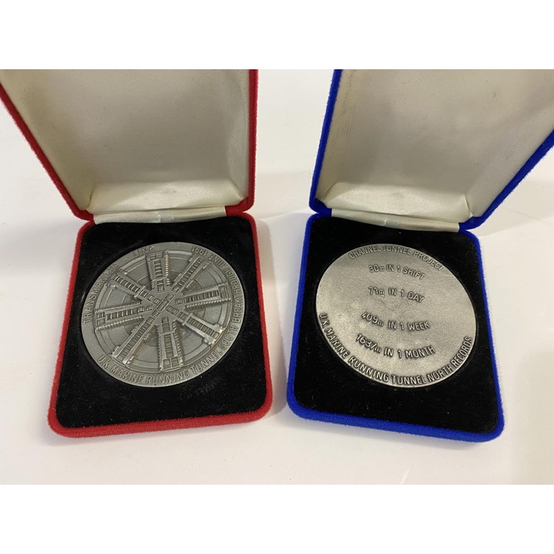The obverse with a depiction of the cutting machinery 'Transmanche Link UK Marine Running Tunnel North Breakthrough May 1991', the obverse 'Channel Tunnel Project 30m in 1 shift 71m in 1 Day 409m in 1 Week, 1637m in 1 Month' 6.8cm diameter, in red and blue cases of issue. (2)